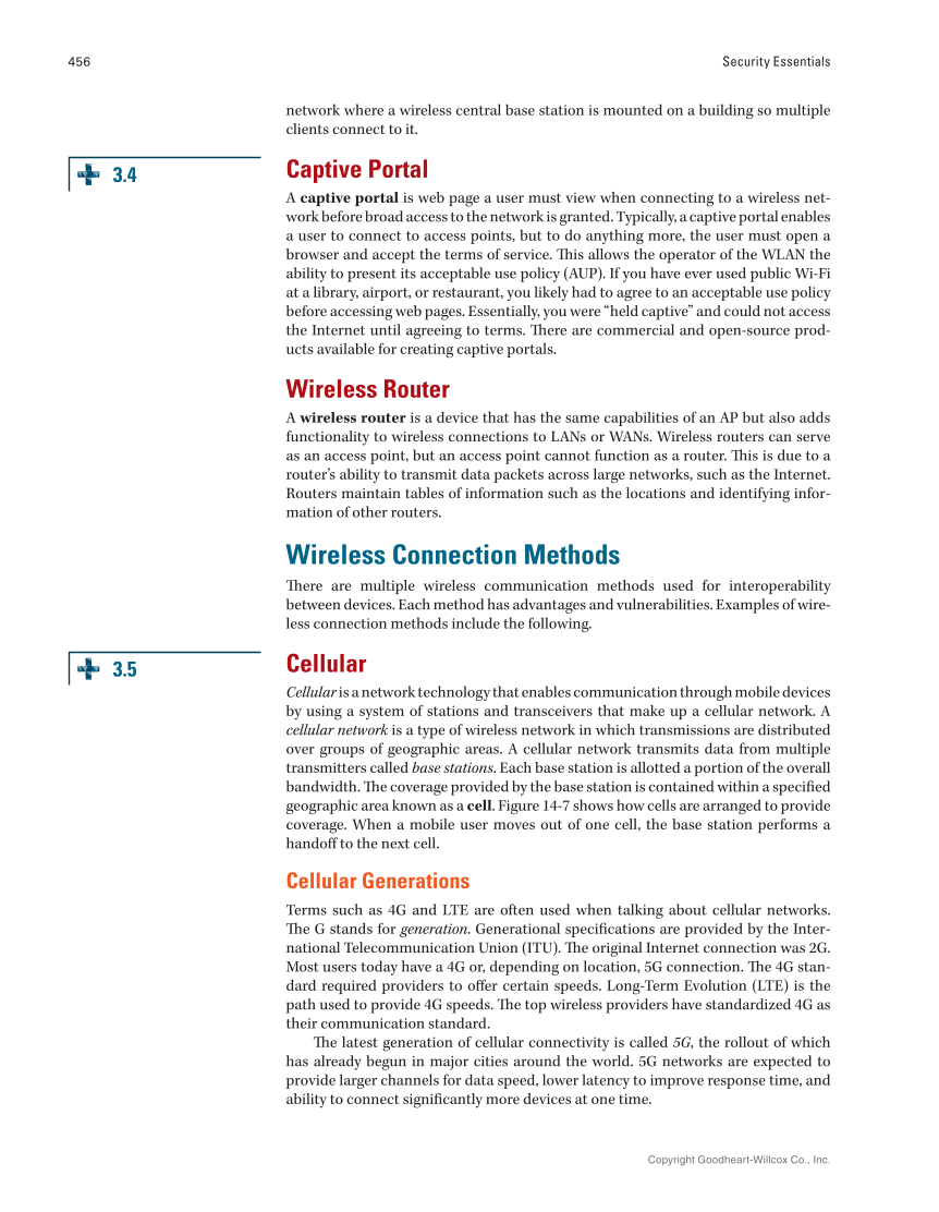 Copyright Goodheart-Willcox Co., Inc. 456 Security Essentials network where a wireless central base station is mounted on a building so multiple clients connect to it. Captive Portal A captive portal is web page a user must view when connecting to a wireless net- work before broad access to the network is granted. Typically, a captive portal enables a user to connect to access points, but to do anything more, the user must open a browser and accept the terms of service. This allows the operator of the WLAN the ability to present its acceptable use policy (AUP). If you have ever used public Wi-Fi at a library, airport, or restaurant, you likely had to agree to an acceptable use policy before accessing web pages. Essentially, you were “held captive” and could not access the Internet until agreeing to terms. There are commercial and open-source prod- ucts available for creating captive portals. Wireless Router A wireless router is a device that has the same capabilities of an AP but also adds functionality to wireless connections to LANs or WANs. Wireless routers can serve as an access point, but an access point cannot function as a router. This is due to a router’s ability to transmit data packets across large networks, such as the Internet. Routers maintain tables of information such as the locations and identifying infor- mation of other routers. Wireless Connection Methods There are multiple wireless communication methods used for interoperability between devices. Each method has advantages and vulnerabilities. Examples of wire- less connection methods include the following. Cellular Cellular is a network technology that enables communication through mobile devices by using a system of stations and transceivers that make up a cellular network. A cellular network is a type of wireless network in which transmissions are distributed over groups of geographic areas. A cellular network transmits data from multiple transmitters called base stations. Each base station is allotted a portion of the overall bandwidth. The coverage provided by the base station is contained within a specified geographic area known as a cell. Figure 14-7 shows how cells are arranged to provide coverage. When a mobile user moves out of one cell, the base station performs a handoff to the next cell. Cellular Generations Terms such as 4G and LTE are often used when talking about cellular networks. The G stands for generation. Generational specifications are provided by the Inter- national Telecommunication Union (ITU). The original Internet connection was 2G. Most users today have a 4G or, depending on location, 5G connection. The 4G stan- dard required providers to offer certain speeds. Long-Term Evolution (LTE) is the path used to provide 4G speeds. The top wireless providers have standardized 4G as their communication standard. The latest generation of cellular connectivity is called 5G, the rollout of which has already begun in major cities around the world. 5G networks are expected to provide larger channels for data speed, lower latency to improve response time, and ability to connect significantly more devices at one time. 3.4 3.5