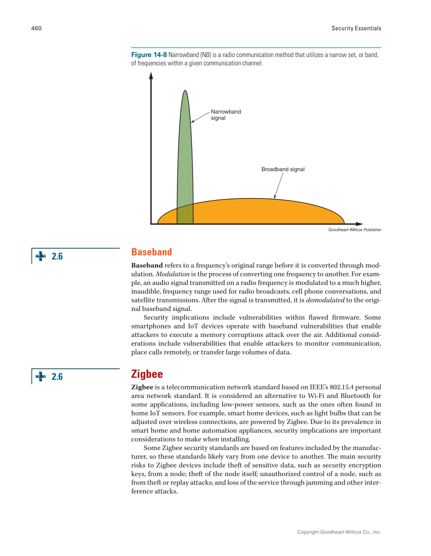 Copyright Goodheart-Willcox Co., Inc. 460 Security Essentials Baseband Baseband refers to a frequency’s original range before it is converted through mod- ulation. Modulation is the process of converting one frequency to another. For exam- ple, an audio signal transmitted on a radio frequency is modulated to a much higher, inaudible, frequency range used for radio broadcasts, cell phone conversations, and satellite transmissions. After the signal is transmitted, it is demodulated to the origi- nal baseband signal. Security implications include vulnerabilities within flawed firmware. Some smartphones and IoT devices operate with baseband vulnerabilities that enable attackers to execute a memory corruptions attack over the air. Additional consid- erations include vulnerabilities that enable attackers to monitor communication, place calls remotely, or transfer large volumes of data. Zigbee Zigbee is a telecommunication network standard based on IEEE’s 802.15.4 personal area network standard. It is considered an alternative to Wi-Fi and Bluetooth for some applications, including low-power sensors, such as the ones often found in home IoT sensors. For example, smart home devices, such as light bulbs that can be adjusted over wireless connections, are powered by Zigbee. Due to its prevalence in smart home and home automation appliances, security implications are important considerations to make when installing. Some Zigbee security standards are based on features included by the manufac- turer, so these standards likely vary from one device to another. The main security risks to Zigbee devices include theft of sensitive data, such as security encryption keys, from a node theft of the node itself unauthorized control of a node, such as from theft or replay attacks and loss of the service through jamming and other inter- ference attacks. 2.6 2.6 Narrowband signal Broadband signal Goodheart-Willcox Publisher Figure 14-8 Narrowband (NB) is a radio communication method that utilizes a narrow set, or band, of frequencies within a given communication channel.