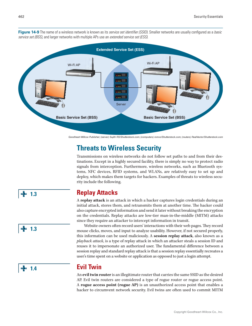 Copyright Goodheart-Willcox Co., Inc. 462 Security Essentials Threats to Wireless Security Transmissions on wireless networks do not follow set paths to and from their des- tinations. Except in a highly secured facility, there is simply no way to protect radio signals from interception. Furthermore, wireless networks, such as Bluetooth sys- tems, NFC devices, RFID systems, and WLANs, are relatively easy to set up and deploy, which makes them targets for hackers. Examples of threats to wireless secu- rity include the following. Replay Attacks A replay attack is an attack in which a hacker captures login credentials during an initial attack, stores them, and retransmits them at another time. The hacker could also capture encrypted information and send it later without breaking the encryption on the credentials. Replay attacks are low-tier man-in-the-middle (MITM) attacks since they require an attacker to intercept information in transit. Website owners often record users’ interactions with their web pages. They record mouse clicks, moves, and input to analyze usability. However, if not secured properly, this information can be used maliciously. A session replay attack, also known as a playback attack, is a type of replay attack in which an attacker steals a session ID and reuses it to impersonate an authorized user. The fundamental difference between a session replay and standard replay attack is that a session replay essentially recreates a user’s time spent on a website or application as opposed to just a login attempt. Evil Twin An evil twin router is an illegitimate router that carries the same SSID as the desired AP. Evil twin routers are considered a type of rogue router or rogue access point. A rogue access point (rogue AP) is an unauthorized access point that enables a hacker to circumvent network security. Evil twins are often used to commit MITM 1.3 1.3 1.4 Server Wi-Fi AP Wi-Fi AP Basic Service Set (BSS) Basic Service Set (BSS) Extended Service Set (ESS) Goodheart-Willcox Publisher (server) Sujith RS/Shutterstock.com (computers) romvo/Shutterstock.com (routers) RealVector/Shutterstock.com Figure 14-9 The name of a wireless network is known as its service set identifier (SSID). Smaller networks are usually configured as a basic service set (BSS), and larger networks with multiple APs use an extended service set (ESS).