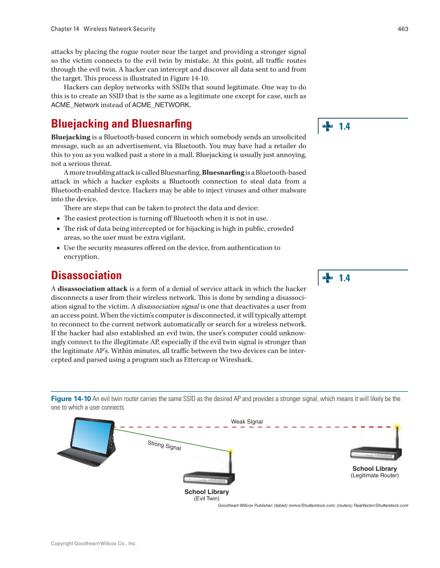 Copyright Goodheart-Willcox Co., Inc. 463 Chapter 14 Wireless Network Security attacks by placing the rogue router near the target and providing a stronger signal so the victim connects to the evil twin by mistake. At this point, all traffic routes through the evil twin. A hacker can intercept and discover all data sent to and from the target. This process is illustrated in Figure 14-10. Hackers can deploy networks with SSIDs that sound legitimate. One way to do this is to create an SSID that is the same as a legitimate one except for case, such as ACME_Network instead of ACME_NETWORK. Bluejacking and Bluesnarfing Bluejacking is a Bluetooth-based concern in which somebody sends an unsolicited message, such as an advertisement, via Bluetooth. You may have had a retailer do this to you as you walked past a store in a mall. Bluejacking is usually just annoying, not a serious threat. A more troubling attack is called Bluesnarfing.BluesnarfingisaBluetooth-based attack in which a hacker exploits a Bluetooth connection to steal data from a Bluetooth-enabled device. Hackers may be able to inject viruses and other malware into the device. There are steps that can be taken to protect the data and device: ■ ■■ The easiest protection is turning off Bluetooth when it is not in use. ■ The risk of data being intercepted or for hijacking is high in public, crowded areas, so the user must be extra vigilant. ■ ■ Use the security measures offered on the device, from authentication to encryption. Disassociation A disassociation attack is a form of a denial of service attack in which the hacker disconnects a user from their wireless network. This is done by sending a disassoci- ation signal to the victim. A disassociation signal is one that deactivates a user from an access point. When the victim’s computer is disconnected, it will typically attempt to reconnect to the current network automatically or search for a wireless network. If the hacker had also established an evil twin, the user’s computer could unknow- ingly connect to the illegitimate AP, especially if the evil twin signal is stronger than the legitimate AP’s. Within minutes, all traffic between the two devices can be inter- cepted and parsed using a program such as Ettercap or Wireshark. 1.4 1.4 School Library (Evil Twin) School Library (Legitimate Router) Strong Signal Weak Signal Goodheart-Willcox Publisher (tablet) romvo/Shutterstock.com (routers) RealVector/Shutterstock.com Figure 14-10 An evil twin router carries the same SSID as the desired AP and provides a stronger signal, which means it will likely be the one to which a user connects.