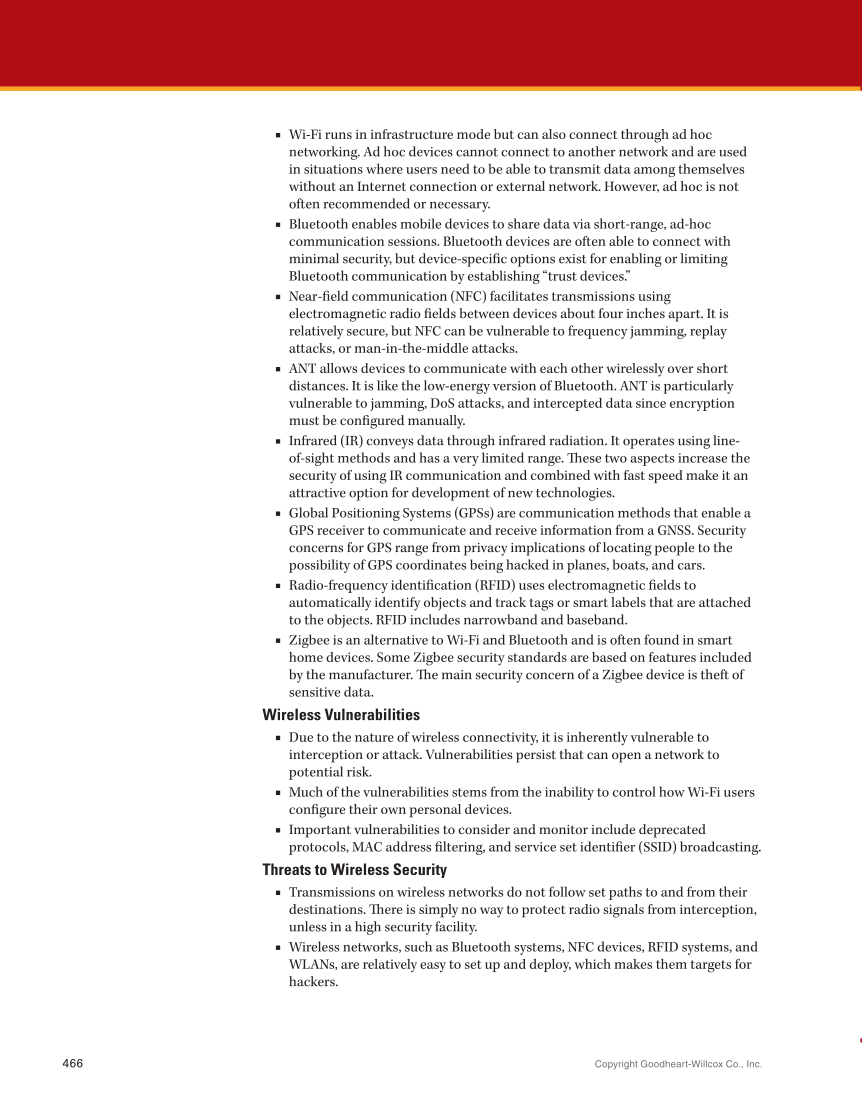 Copyright Goodheart-Willcox Co., Inc. 466 ■ ■ Wi-Fi runs in infrastructure mode but can also connect through ad hoc networking. Ad hoc devices cannot connect to another network and are used in situations where users need to be able to transmit data among themselves without an Internet connection or external network. However, ad hoc is not often recommended or necessary. ■ ■ Bluetooth enables mobile devices to share data via short-range, ad-hoc communication sessions. Bluetooth devices are often able to connect with minimal security, but device-specific options exist for enabling or limiting Bluetooth communication by establishing “trust devices.” ■ ■ Near-field communication (NFC) facilitates transmissions using electromagnetic radio fields between devices about four inches apart. It is relatively secure, but NFC can be vulnerable to frequency jamming, replay attacks, or man-in-the-middle attacks. ■ ■ ANT allows devices to communicate with each other wirelessly over short distances. It is like the low-energy version of Bluetooth. ANT is particularly vulnerable to jamming, DoS attacks, and intercepted data since encryption must be configured manually. ■ ■ Infrared (IR) conveys data through infrared radiation. It operates using line- of-sight methods and has a very limited range. These two aspects increase the security of using IR communication and combined with fast speed make it an attractive option for development of new technologies. ■ ■ Global Positioning Systems (GPSs) are communication methods that enable a GPS receiver to communicate and receive information from a GNSS. Security concerns for GPS range from privacy implications of locating people to the possibility of GPS coordinates being hacked in planes, boats, and cars. ■ ■ Radio-frequency identification (RFID) uses electromagnetic fields to automatically identify objects and track tags or smart labels that are attached to the objects. RFID includes narrowband and baseband. ■ ■ Zigbee is an alternative to Wi-Fi and Bluetooth and is often found in smart home devices. Some Zigbee security standards are based on features included by the manufacturer. The main security concern of a Zigbee device is theft of sensitive data. Wireless Vulnerabilities ■ ■ Due to the nature of wireless connectivity, it is inherently vulnerable to interception or attack. Vulnerabilities persist that can open a network to potential risk. ■ ■ Much of the vulnerabilities stems from the inability to control how Wi-Fi users configure their own personal devices. ■ ■ Important vulnerabilities to consider and monitor include deprecated protocols, MAC address filtering, and service set identifier (SSID) broadcasting. Threats to Wireless Security ■ ■ Transmissions on wireless networks do not follow set paths to and from their destinations. There is simply no way to protect radio signals from interception, unless in a high security facility. ■ ■ Wireless networks, such as Bluetooth systems, NFC devices, RFID systems, and WLANs, are relatively easy to set up and deploy, which makes them targets for hackers.