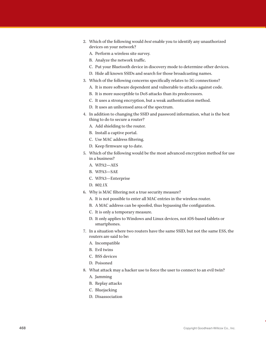 Copyright Goodheart-Willcox Co., Inc. 468 2. Which of the following would best enable you to identify any unauthorized devices on your network? A. Perform a wireless site survey. B. Analyze the network traffic. C. Put your Bluetooth device in discovery mode to determine other devices. D. Hide all known SSIDs and search for those broadcasting names. 3. Which of the following concerns specifically relates to 5G connections? A. It is more software dependent and vulnerable to attacks against code. B. It is more susceptible to DoS attacks than its predecessors. C. It uses a strong encryption, but a weak authentication method. D. It uses an unlicensed area of the spectrum. 4. In addition to changing the SSID and password information, what is the best thing to do to secure a router? A. Add shielding to the router. B. Install a captive portal. C. Use MAC address filtering. D. Keep firmware up to date. 5. Which of the following would be the most advanced encryption method for use in a business? A. WPA2—AES B. WPA3—SAE C. WPA3—Enterprise D. 802.1X 6. Why is MAC filtering not a true security measure? A. It is not possible to enter all MAC entries in the wireless router. B. A MAC address can be spoofed, thus bypassing the configuration. C. It is only a temporary measure. D. It only applies to Windows and Linux devices, not iOS-based tablets or smartphones. 7. In a situation where two routers have the same SSID, but not the same ESS, the routers are said to be: A. Incompatible B. Evil twins C. BSS devices D. Poisoned 8. What attack may a hacker use to force the user to connect to an evil twin? A. Jamming B. Replay attacks C. Bluejacking D. Disassociation