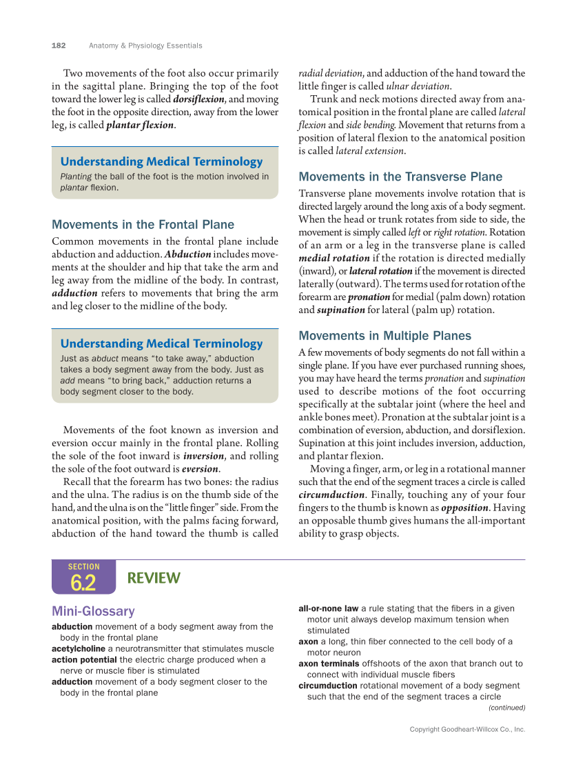 182 Anatomy & Physiology Essentials Copyright Goodheart-Willcox Co., Inc. radial deviation, and adduction of the hand toward the little finger is called ulnar deviation. Trunk and neck motions directed away from ana- tomical position in the frontal plane are called lateral flexion and side bending. Movement that returns from a position of lateral flexion to the anatomical position is called lateral extension. Movements in the Transverse Plane Transverse plane movements involve rotation that is directed largely around the long axis of a body segment. When the head or trunk rotates from side to side, the movement is simply called left or right rotation. Rotation of an arm or a leg in the transverse plane is called medial rotation if the rotation is directed medially (inward), or lateral rotation if the movement is directed laterally (outward). The terms used for rotation of the forearm are pronation for medial (palm down) rotation and supination for lateral (palm up) rotation. Movements in Multiple Planes A few movements of body segments do not fall within a single plane. If you have ever purchased running shoes, you may have heard the terms pronation and supination used to describe motions of the foot occurring specifically at the subtalar joint (where the heel and ankle bones meet). Pronation at the subtalar joint is a combination of eversion, abduction, and dorsiflexion. Supination at this joint includes inversion, adduction, and plantar flexion. Moving a finger, arm, or leg in a rotational manner such that the end of the segment traces a circle is called circumduction. Finally, touching any of your four fingers to the thumb is known as opposition. Having an opposable thumb gives humans the all-important ability to grasp objects. Two movements of the foot also occur primarily in the sagittal plane. Bringing the top of the foot toward the lower leg is called dorsiflexion, and moving the foot in the opposite direction, away from the lower leg, is called plantar flexion. Understanding Medical Terminology Planting the ball of the foot is the motion involved in plantar flexion. Movements in the Frontal Plane Common movements in the frontal plane include abduction and adduction. Abduction includes move- ments at the shoulder and hip that take the arm and leg away from the midline of the body. In contrast, adduction refers to movements that bring the arm and leg closer to the midline of the body. Understanding Medical Terminology Just as abduct means “to take away,” abduction takes a body segment away from the body. Just as add means “to bring back,” adduction returns a body segment closer to the body. Movements of the foot known as inversion and eversion occur mainly in the frontal plane. Rolling the sole of the foot inward is inversion, and rolling the sole of the foot outward is eversion. Recall that the forearm has two bones: the radius and the ulna. The radius is on the thumb side of the hand, and the ulna is on the “little finger” side. From the anatomical position, with the palms facing forward, abduction of the hand toward the thumb is called SECTION 6.2 REVIEW Mini-Glossary abduction movement of a body segment away from the body in the frontal plane acetylcholine a neurotransmitter that stimulates muscle action potential the electric charge produced when a nerve or muscle fiber is stimulated adduction movement of a body segment closer to the body in the frontal plane all-or-none law a rule stating that the fibers in a given motor unit always develop maximum tension when stimulated axon a long, thin fiber connected to the cell body of a motor neuron axon terminals offshoots of the axon that branch out to connect with individual muscle fibers circumduction rotational movement of a body segment such that the end of the segment traces a circle (continued)