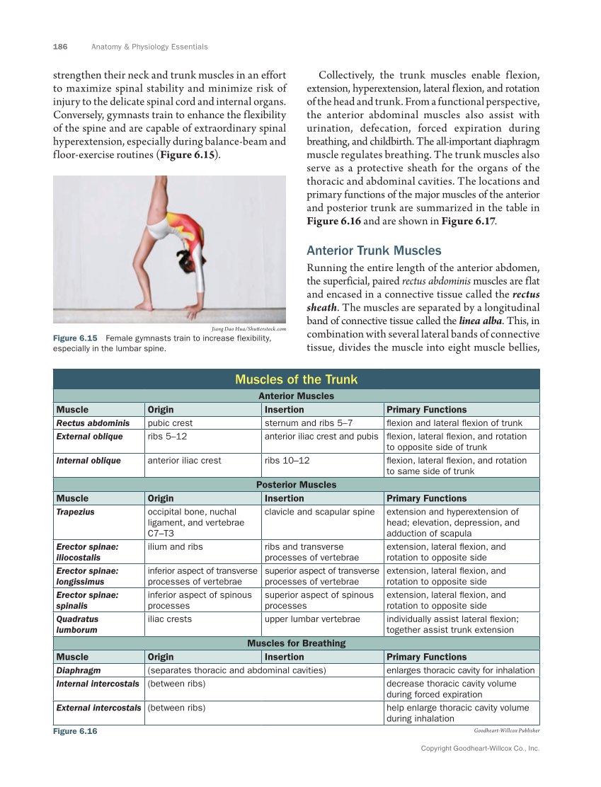 186 Anatomy & Physiology Essentials Copyright Goodheart-Willcox Co., Inc. Collectively, the trunk muscles enable flexion, extension, hyperextension, lateral flexion, and rotation of the head and trunk. From a functional perspective, the anterior abdominal muscles also assist with urination, defecation, forced expiration during breathing, and childbirth. The all-important diaphragm muscle regulates breathing. The trunk muscles also serve as a protective sheath for the organs of the thoracic and abdominal cavities. The locations and primary functions of the major muscles of the anterior and posterior trunk are summarized in the table in Figure 6.16 and are shown in Figure 6.17. Anterior Trunk Muscles Running the entire length of the anterior abdomen, the superficial, paired rectus abdominis muscles are flat and encased in a connective tissue called the rectus sheath. The muscles are separated by a longitudinal band of connective tissue called the linea alba. This, in combination with several lateral bands of connective tissue, divides the muscle into eight muscle bellies, strengthen their neck and trunk muscles in an effort to maximize spinal stability and minimize risk of injury to the delicate spinal cord and internal organs. Conversely, gymnasts train to enhance the flexibility of the spine and are capable of extraordinary spinal hyperextension, especially during balance-beam and floor-exercise routines (Figure 6.15). Muscles of the Trunk Anterior Muscles Muscle Origin Insertion Primary Functions Rectus abdominis pubic crest sternum and ribs 5–7 flexion and lateral flexion of trunk External oblique ribs 5–12 anterior iliac crest and pubis flexion, lateral flexion, and rotation to opposite side of trunk Internal oblique anterior iliac crest ribs 10–12 flexion, lateral flexion, and rotation to same side of trunk Posterior Muscles Muscle Origin Insertion Primary Functions Trapezius occipital bone, nuchal ligament, and vertebrae C7–T3 clavicle and scapular spine extension and hyperextension of head elevation, depression, and adduction of scapula Erector spinae: iliocostalis ilium and ribs ribs and transverse processes of vertebrae extension, lateral flexion, and rotation to opposite side Erector spinae: longissimus inferior aspect of transverse processes of vertebrae superior aspect of transverse processes of vertebrae extension, lateral flexion, and rotation to opposite side Erector spinae: spinalis inferior aspect of spinous processes superior aspect of spinous processes extension, lateral flexion, and rotation to opposite side Quadratus lumborum iliac crests upper lumbar vertebrae individually assist lateral flexion together assist trunk extension Muscles for Breathing Muscle Origin Insertion Primary Functions Diaphragm (separates thoracic and abdominal cavities) enlarges thoracic cavity for inhalation Internal intercostals (between ribs) decrease thoracic cavity volume during forced expiration External intercostals (between ribs) help enlarge thoracic cavity volume during inhalation Figure 6.16 Goodheart-Willcox Publisher Jiang Dao Hua/Shutterstock.com Figure 6.15 Female gymnasts train to increase flexibility, especially in the lumbar spine.
