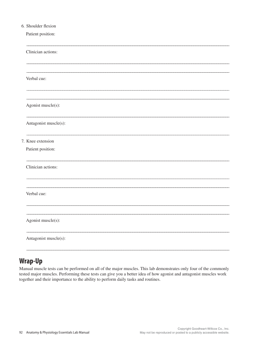 Copyright Goodheart-Willcox Co., Inc. May not be reproduced or posted to a publicly accessible website. 92 Anatomy & Physiology Essentials Lab Manual 6. Shoulder flexion Patient position: _ _________________________________________________________________________________________________________________ Clinician actions: _ __________________________________________________________________________________________________________________ _________________________________________________________________________________________________________________ Verbal cue: _ __________________________________________________________________________________________________________________ _________________________________________________________________________________________________________________ Agonist muscle(s): _ _________________________________________________________________________________________________________________ Antagonist muscle(s): _ _________________________________________________________________________________________________________________ 7. Knee extension Patient position: _ _________________________________________________________________________________________________________________ Clinician actions: _ __________________________________________________________________________________________________________________ _________________________________________________________________________________________________________________ Verbal cue: _ __________________________________________________________________________________________________________________ _________________________________________________________________________________________________________________ Agonist muscle(s): _ _________________________________________________________________________________________________________________ Antagonist muscle(s): _ _________________________________________________________________________________________________________________ Wrap-Up Manual muscle tests can be performed on all of the major muscles. This lab demonstrates only four of the commonly tested major muscles. Performing these tests can give you a better idea of how agonist and antagonist muscles work together and their importance to the ability to perform daily tasks and routines.