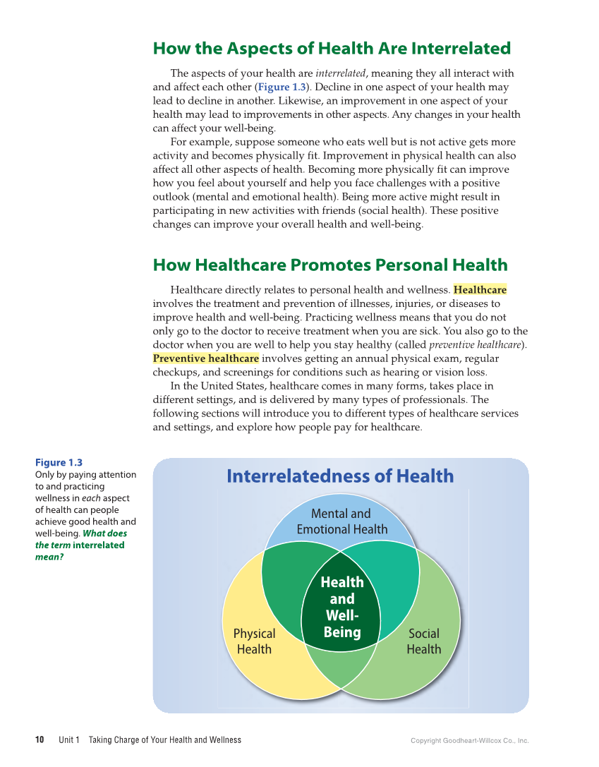 Unit 1 Taking Charge of Your Health and Wellness Copyright Goodheart-Willcox Co., Inc. 10 How the Aspects of Health Are Interrelated The aspects of your health are interrelated, meaning they all interact with and affect each other (Figure 1.3). Decline in one aspect of your health may lead to decline in another. Likewise, an improvement in one aspect of your health may lead to improvements in other aspects. Any changes in your health can affect your well-being. For example, suppose someone who eats well but is not active gets more activity and becomes physically fit. Improvement in physical health can also affect all other aspects of health. Becoming more physically fit can improve how you feel about yourself and help you face challenges with a positive outlook (mental and emotional health). Being more active might result in participating in new activities with friends (social health). These positive changes can improve your overall health and well-being. How Healthcare Promotes Personal Health Healthcare directly relates to personal health and wellness. Healthcare involves the treatment and prevention of illnesses, injuries, or diseases to improve health and well-being. Practicing wellness means that you do not only go to the doctor to receive treatment when you are sick. You also go to the doctor when you are well to help you stay healthy (called preventive healthcare). Preventive healthcare involves getting an annual physical exam, regular checkups, and screenings for conditions such as hearing or vision loss. In the United States, healthcare comes in many forms, takes place in different settings, and is delivered by many types of professionals. The following sections will introduce you to different types of healthcare services and settings, and explore how people pay for healthcare. Health and Well- Being Physical Health Social Health Mental and Emotional Health Interrelatedness of Health Figure 1.3 Only by paying attention to and practicing wellness in each aspect of health can people achieve good health and well-being. What does the term interrelated mean?