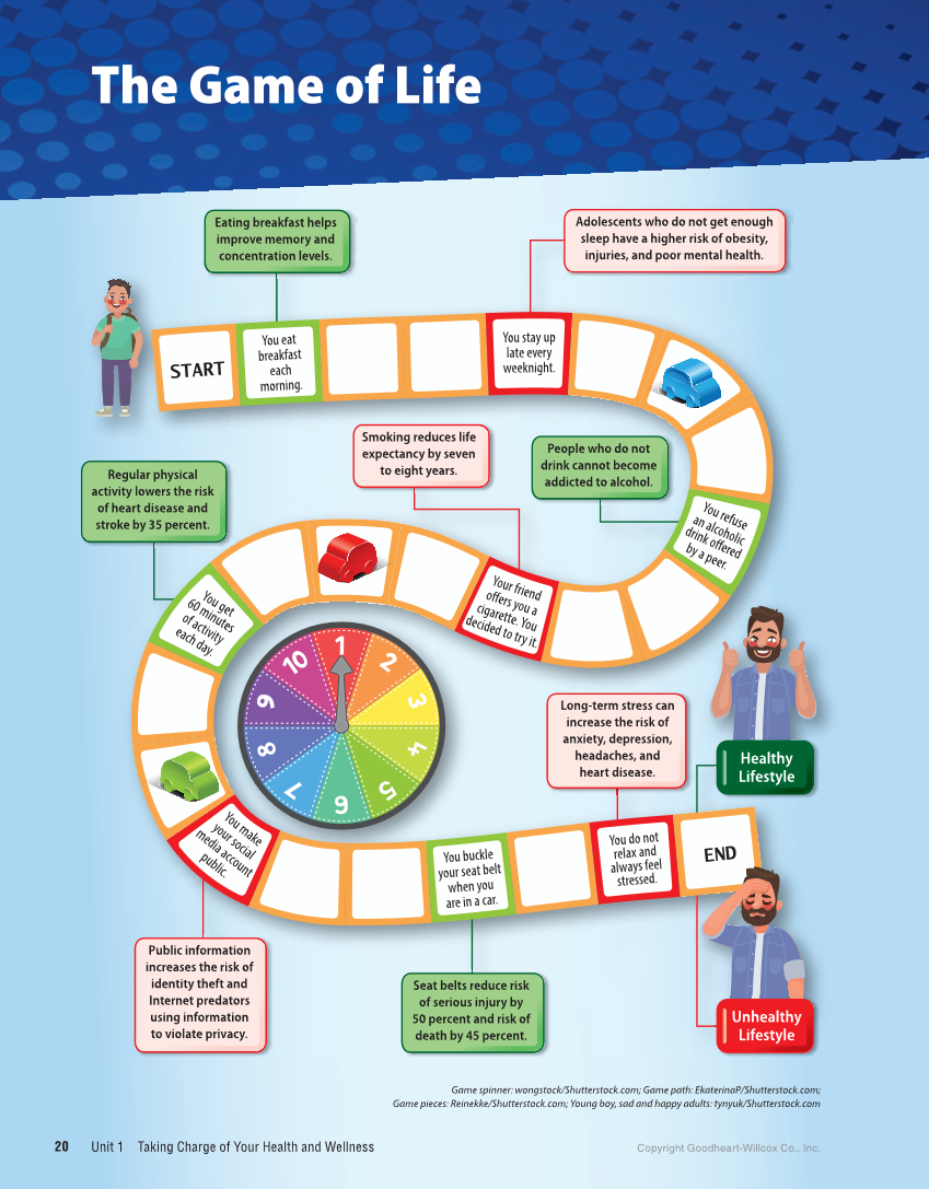 The Game of Life START END You eat breakfast each morning. You stay up late every weeknight. You refuse an alcoholic drink offered by a peer. Your friend offers you a cigarette. You decided to try it. You get 60 minutes of activity each day. You make your social media account public. You buckle your seat belt when you are in a car. You do not relax and always feel stressed. Adolescents who do not get enough sleep have a higher risk of obesity, injuries, and poor mental health. Eating breakfast helps improve memory and concentration levels. People who do not drink cannot become addicted to alcohol. Smoking reduces life expectancy by seven to eight years. Regular physical activity lowers the risk of heart disease and stroke by 35 percent. Public information increases the risk of identity theft and Internet predators using information to violate privacy. Seat belts reduce risk of serious injury by 50 percent and risk of death by 45 percent. Long-term stress can increase the risk of anxiety, depression, headaches, and heart disease. Healthy Lifestyle Unhealthy Lifestyle Game spinner: wongstock/Shutterstock.com Game path: EkaterinaP/Shutterstock.com Game pieces: Reinekke/Shutterstock.com Young boy, sad and happy adults: tynyuk/Shutterstock.com Unit 1 Taking Charge of Your Health and Wellness Copyright Goodheart-Willcox Co., Inc. 20