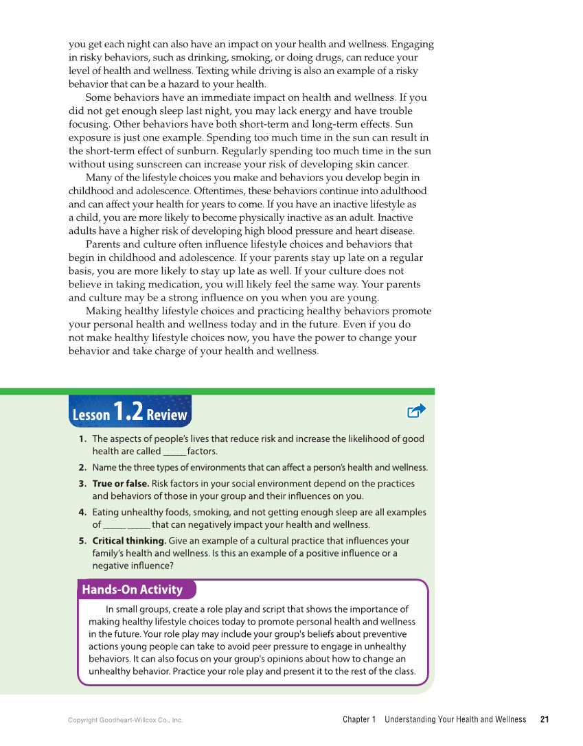 Copyright Goodheart-Willcox Co., Inc. Chapter 1 Understanding Your Health and Wellness 21 you get each night can also have an impact on your health and wellness. Engaging in risky behaviors, such as drinking, smoking, or doing drugs, can reduce your level of health and wellness. Texting while driving is also an example of a risky behavior that can be a hazard to your health. Some behaviors have an immediate impact on health and wellness. If you did not get enough sleep last night, you may lack energy and have trouble focusing. Other behaviors have both short-term and long-term effects. Sun exposure is just one example. Spending too much time in the sun can result in the short-term effect of sunburn. Regularly spending too much time in the sun without using sunscreen can increase your risk of developing skin cancer. Many of the lifestyle choices you make and behaviors you develop begin in childhood and adolescence. Oftentimes, these behaviors continue into adulthood and can affect your health for years to come. If you have an inactive lifestyle as a child, you are more likely to become physically inactive as an adult. Inactive adults have a higher risk of developing high blood pressure and heart disease. Parents and culture often influence lifestyle choices and behaviors that begin in childhood and adolescence. If your parents stay up late on a regular basis, you are more likely to stay up late as well. If your culture does not believe in taking medication, you will likely feel the same way. Your parents and culture may be a strong influence on you when you are young. Making healthy lifestyle choices and practicing healthy behaviors promote your personal health and wellness today and in the future. Even if you do not make healthy lifestyle choices now, you have the power to change your behavior and take charge of your health and wellness. Lesson 1.2 Review 1. The aspects of people’s lives that reduce risk and increase the likelihood of good health are called _____ factors. 2. Name the three types of environments that can affect a person’s health and wellness. 3. True or false. Risk factors in your social environment depend on the practices and behaviors of those in your group and their influences on you. 4. Eating unhealthy foods, smoking, and not getting enough sleep are all examples of _____ _____ that can negatively impact your health and wellness. 5. Critical thinking. Give an example of a cultural practice that influences your family’s health and wellness. Is this an example of a positive influence or a negative influence? In small groups, create a role play and script that shows the importance of making healthy lifestyle choices today to promote personal health and wellness in the future. Your role play may include your group's beliefs about preventive actions young people can take to avoid peer pressure to engage in unhealthy behaviors. It can also focus on your group's opinions about how to change an unhealthy behavior. Practice your role play and present it to the rest of the class. Hands-On Activity