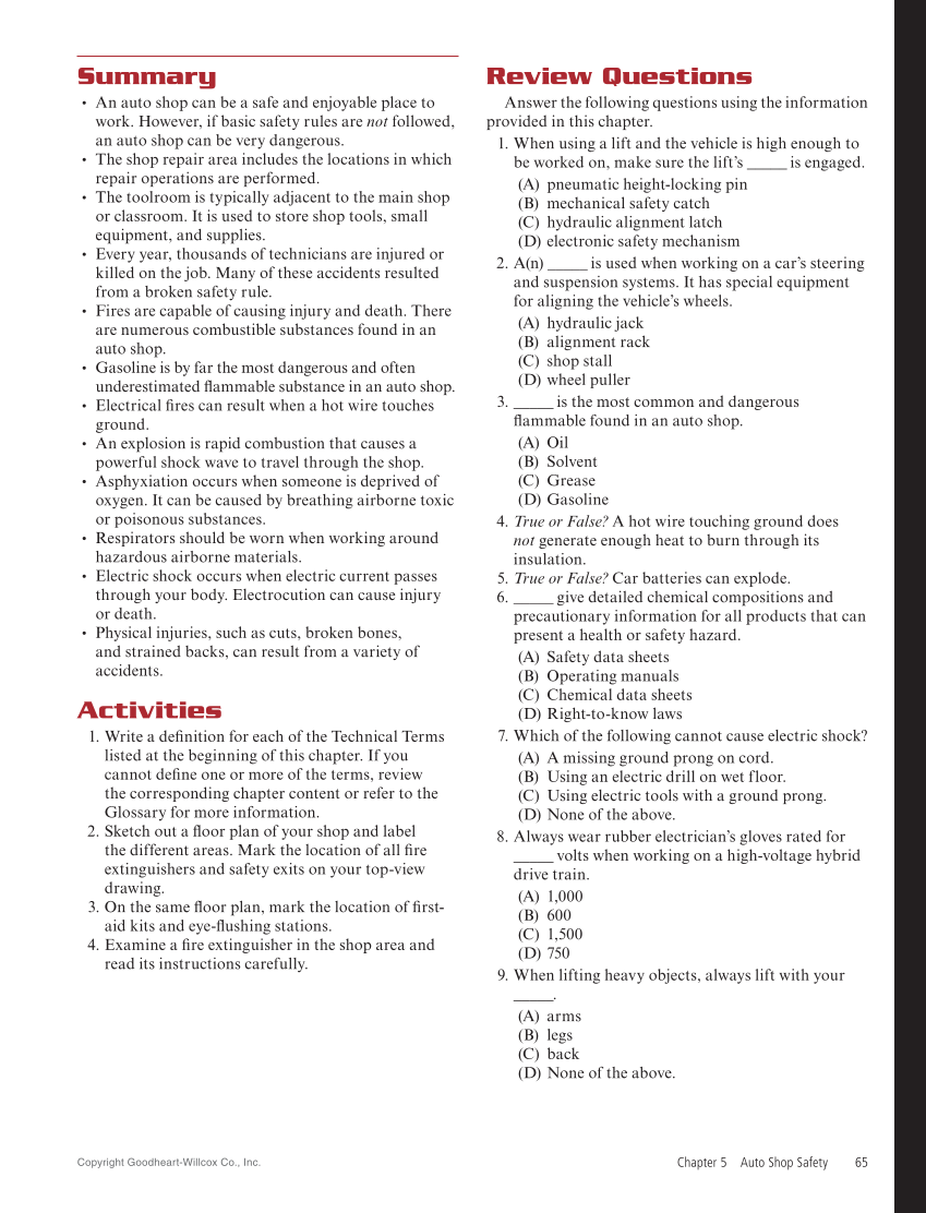 Chapter 5 Auto Shop Safety 65 Copyright Goodheart-Willcox Co., Inc. Summary • An auto shop can be a safe and enjoyable place to work. However, if basic safety rules are not followed, an auto shop can be very dangerous. • The shop repair area includes the locations in which repair operations are performed. • The toolroom is typically adjacent to the main shop or classroom. It is used to store shop tools, small equipment, and supplies. • Every year, thousands of technicians are injured or killed on the job. Many of these accidents resulted from a broken safety rule. • Fires are capable of causing injury and death. There are numerous combustible substances found in an auto shop. • Gasoline is by far the most dangerous and often underestimated flammable substance in an auto shop. • Electrical fires can result when a hot wire touches ground. • An explosion is rapid combustion that causes a powerful shock wave to travel through the shop. • Asphyxiation occurs when someone is deprived of oxygen. It can be caused by breathing airborne toxic or poisonous substances. • Respirators should be worn when working around hazardous airborne materials. • Electric shock occurs when electric current passes through your body. Electrocution can cause injury or death. • Physical injuries, such as cuts, broken bones, and strained backs, can result from a variety of accidents. Activities 1. Write a definition for each of the Technical Terms listed at the beginning of this chapter. If you cannot define one or more of the terms, review the corresponding chapter content or refer to the Glossary for more information. 2. Sketch out a floor plan of your shop and label the different areas. Mark the location of all fire extinguishers and safety exits on your top-view drawing. 3. On the same floor plan, mark the location of first- aid kits and eye-flushing stations. 4. Examine a fire extinguisher in the shop area and read its instructions carefully. Review Questions Answer the following questions using the information provided in this chapter. 1. When using a lift and the vehicle is high enough to be worked on, make sure the lift’s _____is engaged. (A) pneumatic height-locking pin (B) mechanical safety catch (C) hydraulic alignment latch (D) electronic safety mechanism 2. A(n) _____is used when working on a car’s steering and suspension systems. It has special equipment for aligning the vehicle’s wheels. (A) hydraulic jack (B) alignment rack (C) shop stall (D) wheel puller 3. _____is the most common and dangerous flammable found in an auto shop. (A) Oil (B) Solvent (C) Grease (D) Gasoline 4. True or False? A hot wire touching ground does not generate enough heat to burn through its insulation. 5. True or False? Car batteries can explode. 6. _____give detailed chemical compositions and precautionary information for all products that can present a health or safety hazard. (A) Safety data sheets (B) Operating manuals (C) Chemical data sheets (D) Right-to-know laws 7. Which of the following cannot cause electric shock? (A) A missing ground prong on cord. (B) Using an electric drill on wet floor. (C) Using electric tools with a ground prong. (D) None of the above. 8. Always wear rubber electrician’s gloves rated for _____volts when working on a high-voltage hybrid drive train. (A) 1,000 (B) 600 (C) 1,500 (D) 750 9. When lifting heavy objects, always lift with your _____.(A) arms (B) legs (C) back (D) None of the above.