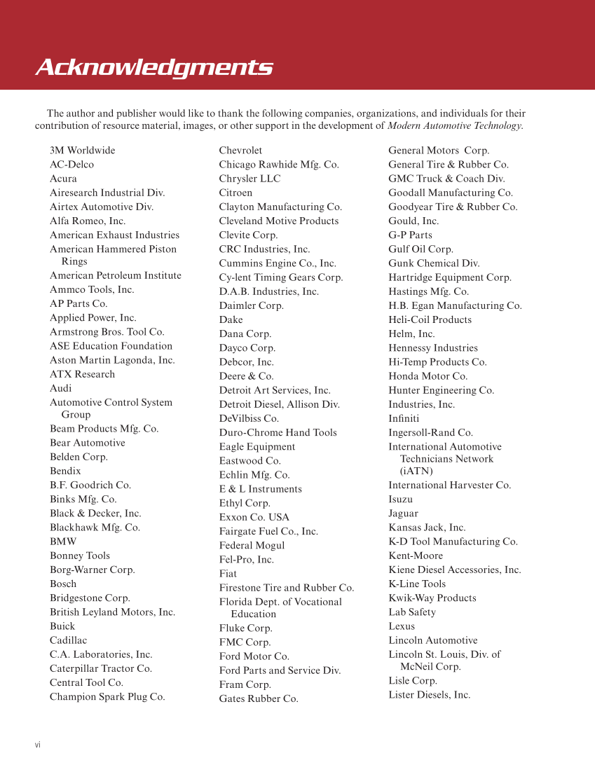 vi Acknowledgments The author and publisher would like to thank the following companies, organizations, and individuals for their contribution of resource material, images, or other support in the development of Modern Automotive Technology. 3M Worldwide AC-Delco Acura Airesearch Industrial Div. Airtex Automotive Div. Alfa Romeo, Inc. American Exhaust Industries American Hammered Piston Rings American Petroleum Institute Ammco Tools, Inc. AP Parts Co. Applied Power, Inc. Armstrong Bros. Tool Co. ASE Education Foundation Aston Martin Lagonda, Inc. ATX Research Audi Automotive Control System Group Beam Products Mfg. Co. Bear Automotive Belden Corp. Bendix B.F. Goodrich Co. Binks Mfg. Co. Black &Decker, Inc. Blackhawk Mfg. Co. BMW Bonney Tools Borg-Warner Corp. Bosch Bridgestone Corp. British Leyland Motors, Inc. Buick Cadillac C.A. Laboratories, Inc. Caterpillar Tractor Co. Central Tool Co. Champion Spark Plug Co. Chevrolet Chicago Rawhide Mfg. Co. Chrysler LLC Citroen Clayton Manufacturing Co. Cleveland Motive Products Clevite Corp. CRC Industries, Inc. Cummins Engine Co., Inc. Cy-lent Timing Gears Corp. D.A.B. Industries, Inc. Daimler Corp. Dake Dana Corp. Dayco Corp. Debcor, Inc. Deere &Co. Detroit Art Services, Inc. Detroit Diesel, Allison Div. DeVilbiss Co. Duro-Chrome Hand Tools Eagle Equipment Eastwood Co. Echlin Mfg. Co. E &L Instruments Ethyl Corp. Exxon Co. USA Fairgate Fuel Co., Inc. Federal Mogul Fel-Pro, Inc. Fiat Firestone Tire and Rubber Co. Florida Dept. of Vocational Education Fluke Corp. FMC Corp. Ford Motor Co. Ford Parts and Service Div. Fram Corp. Gates Rubber Co. General Motors Corp. General Tire &Rubber Co. GMC Truck &Coach Div. Goodall Manufacturing Co. Goodyear Tire &Rubber Co. Gould, Inc. G-P Parts Gulf Oil Corp. Gunk Chemical Div. Hartridge Equipment Corp. Hastings Mfg. Co. H.B. Egan Manufacturing Co. Heli-Coil Products Helm, Inc. Hennessy Industries Hi-Temp Products Co. Honda Motor Co. Hunter Engineering Co. Industries, Inc. Infiniti Ingersoll-Rand Co. International Automotive Technicians Network (iATN) International Harvester Co. Isuzu Jaguar Kansas Jack, Inc. K-D Tool Manufacturing Co. Kent-Moore Kiene Diesel Accessories, Inc. K-Line Tools Kwik-Way Products Lab Safety Lexus Lincoln Automotive Lincoln St. Louis, Div. of McNeil Corp. Lisle Corp. Lister Diesels, Inc.