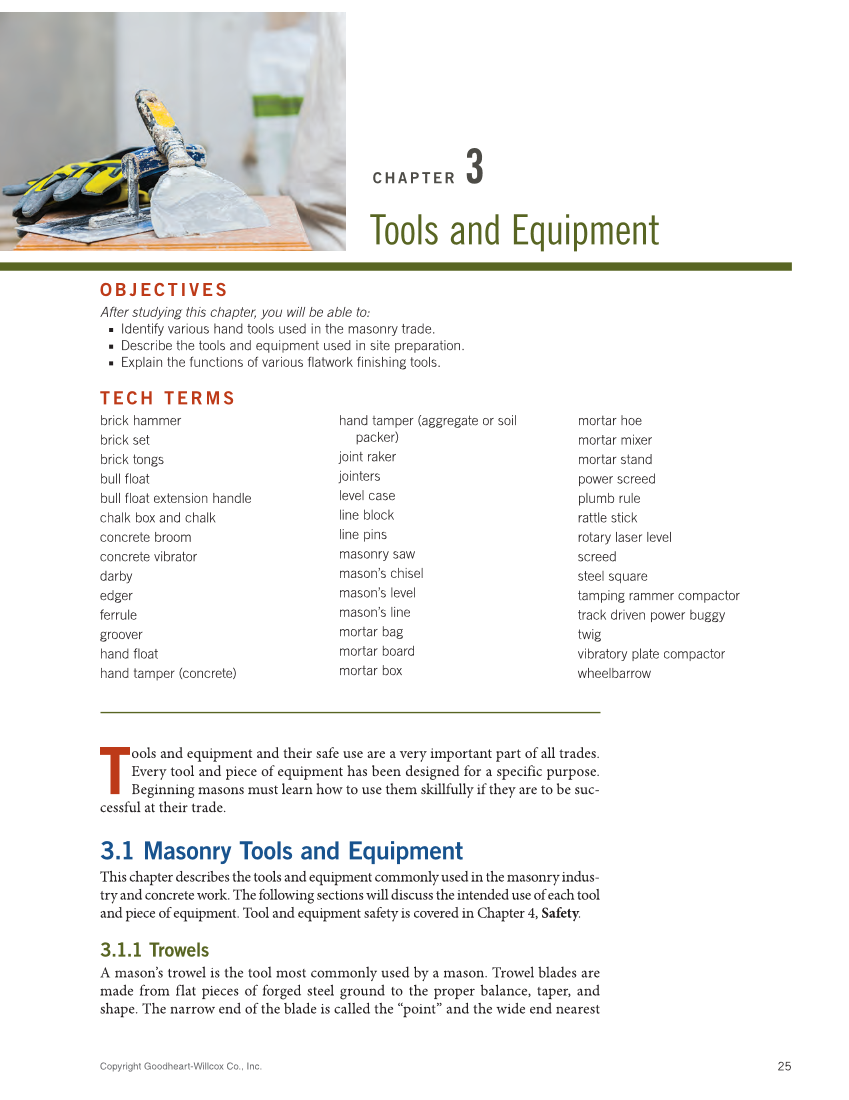 Copyright Goodheart-Willcox Co., Inc. 25 C H A P T ER 3 Tools and Equipment OBJECTIVES After studying this chapter, you will be able to: ■ ■■ Identify various hand tools used in the masonry trade. ■■ Describe the tools and equipment used in site preparation. ■ Explain the functions of various flatwork finishing tools. TECH TERMS brick hammer brick set brick tongs bull float bull float extension handle chalk box and chalk concrete broom concrete vibrator darby edger ferrule groover hand float hand tamper (concrete) hand tamper (aggregate or soil packer) joint raker jointers level case line block line pins masonry saw mason’s chisel mason’s level mason’s line mortar bag mortar board mortar box mortar hoe mortar mixer mortar stand power screed plumb rule rattle stick rotary laser level screed steel square tamping rammer compactor track driven power buggy twig vibratory plate compactor wheelbarrow TBeginning ools and equipment and their safe use are a very important part of all trades. Every tool and piece of equipment has been designed for a specific purpose. masons must learn how to use them skillfully if they are to be suc- cessful at their trade. 3.1 Masonry Tools and Equipment This chapter describes the tools and equipment commonly used in the masonry indus- try and concrete work. The following sections will discuss the intended use of each tool and piece of equipment. Tool and equipment safety is covered in Chapter 4, Safety. 3.1.1 Trowels A mason’s trowel is the tool most commonly used by a mason. Trowel blades are made from flat pieces of forged steel ground to the proper balance, taper, and shape. The narrow end of the blade is called the “point” and the wide end nearest