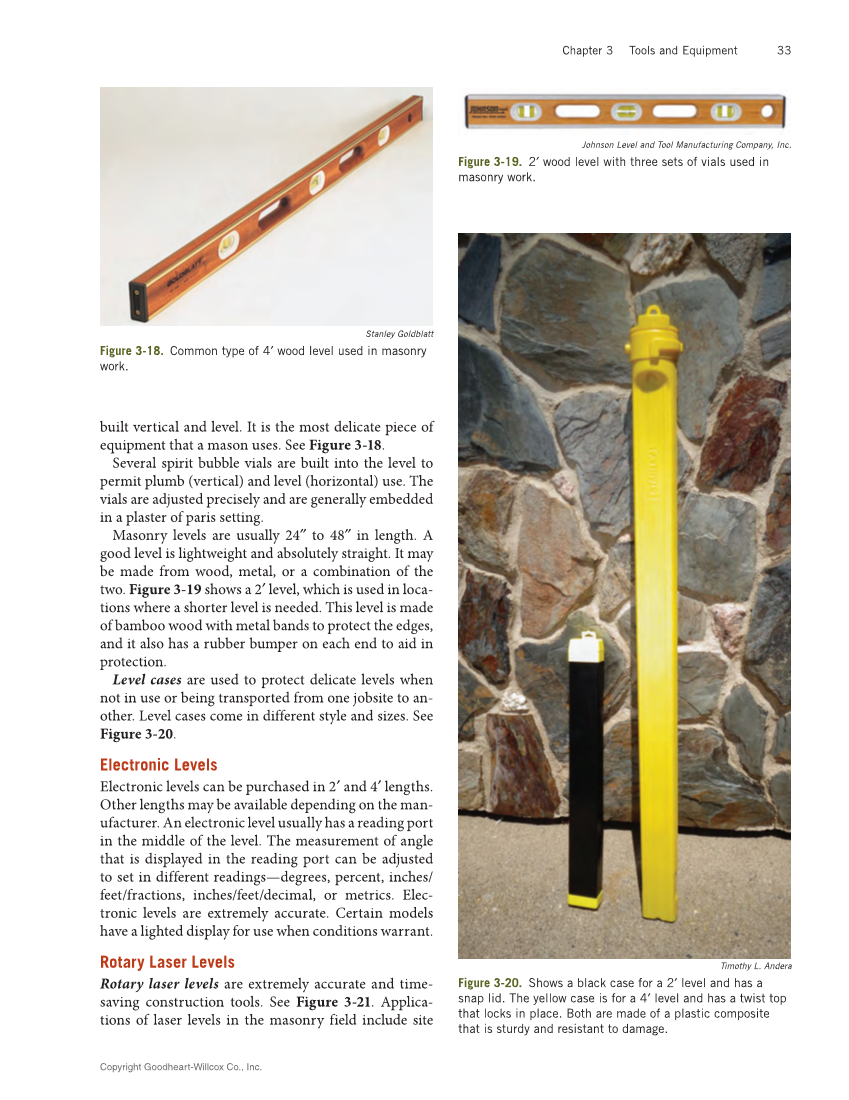 Copyright Goodheart-Willcox Co., Inc. Chapter 3 Tools and Equipment 33 built vertical and level. It is the most delicate piece of equipment that a mason uses. See Figure 3‑18. Several spirit bubble vials are built into the level to permit plumb (vertical) and level (horizontal) use. The vials are adjusted precisely and are generally embedded in a plaster of paris setting. Masonry levels are usually 24″ to 48″ in length. A good level is lightweight and absolutely straight. It may be made from wood, metal, or a combination of the two. Figure 3‑19 shows a 2′ level, which is used in loca- tions where a shorter level is needed. This level is made of bamboo wood with metal bands to protect the edges, and it also has a rubber bumper on each end to aid in protection. Level cases are used to protect delicate levels when not in use or being transported from one jobsite to an- other. Level cases come in different style and sizes. See Figure 3‑20. Electronic Levels Electronic levels can be purchased in 2′ and 4′ lengths. Other lengths may be available depending on the man- ufacturer. An electronic level usually has a reading port in the middle of the level. The measurement of angle that is displayed in the reading port can be adjusted to set in different readings—degrees, percent, inches/ feet/fractions, inches/feet/decimal, or metrics. Elec- tronic levels are extremely accurate. Certain models have a lighted display for use when conditions warrant. Rotary Laser Levels Rotary laser levels are extremely accurate and time- saving construction tools. See Figure 3‑21. Applica- tions of laser levels in the masonry field include site Stanley Goldblatt Figure 3‑18. Common type of 4′ wood level used in masonry work. Johnson Level and Tool Manufacturing Company, Inc. Figure 3‑19. 2′ wood level with three sets of vials used in masonry work. Timothy L. Andera Figure 3‑20. Shows a black case for a 2′ level and has a snap lid. The yellow case is for a 4′ level and has a twist top that locks in place. Both are made of a plastic composite that is sturdy and resistant to damage.