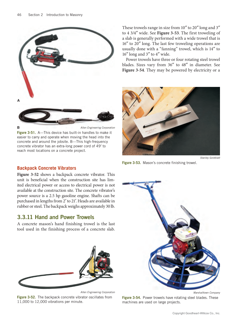 Copyright Goodheart-Willcox Co., Inc. 46 Section 2 Introduction to Masonry Backpack Concrete Vibrators Figure 3‑52 shows a backpack concrete vibrator. This unit is beneficial when the construction site has lim- ited electrical power or access to electrical power is not available at the construction site. The concrete vibrator’s power source is a 2.5 hp gasoline engine. Shafts can be purchased in lengths from 2′ to 21′. Heads are available in rubber or steel. The backpack weighs approximately 30 lb. 3.3.11 Hand and Power Trowels A concrete mason’s hand finishing trowel is the last tool used in the finishing process of a concrete slab. These trowels range in size from 10″ to 20″ long and 3″ to 4 3/4″ wide. See Figure 3‑53. The first troweling of a slab is generally performed with a wide trowel that is 16″ to 20″ long. The last few troweling operations are usually done with a “fanning” trowel, which is 14″ to 16″ long and 3″ to 4″ wide. Power trowels have three or four rotating steel trowel blades. Sizes vary from 36″ to 48″ in diameter. See Figure 3‑54. They may be powered by electricity or a Allen Engineering Corporation Figure 3‑52. The backpack concrete vibrator oscillates from 11,000 to 12,000 vibrations per minute. Stanley Goldblatt Figure 3‑53. Mason’s concrete finishing trowel. Marshalltown Company Figure 3‑54. Power trowels have rotating steel blades. These machines are used on large projects. A B Allen Engineering Corporation Figure 3‑51. A—This device has built-in handles to make it easier to carry and operate when moving the head into the concrete and around the jobsite. B—This high-frequency concrete vibrator has an extra-long power cord of 49′ to reach most locations on a concrete project.