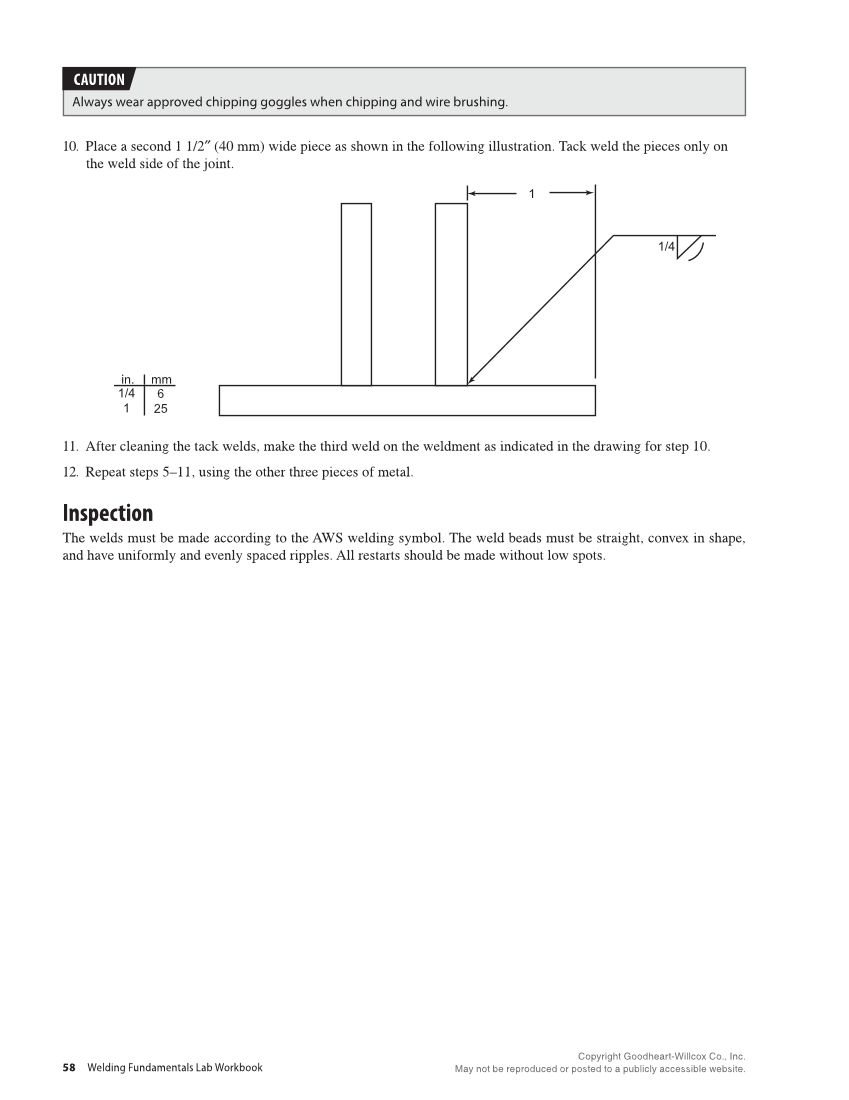 Copyright Goodheart-Willcox Co., Inc. May not be reproduced or posted to a publicly accessible website. 58 Welding Fundamentals Lab Workbook Always wear approved chipping goggles when chipping and wire brushing. CAUTION 10. Place a second 1 1/2″ (40 mm) wide piece as shown in the following illustration. Tack weld the pieces only on the weld side of the joint. 1/4 1 in. mm 1/4 1 6 25 11. After cleaning the tack welds, make the third weld on the weldment as indicated in the drawing for step 10. 12. Repeat steps 5–11, using the other three pieces of metal. Inspection The welds must be made according to the AWS welding symbol. The weld beads must be straight, convex in shape, and have uniformly and evenly spaced ripples. All restarts should be made without low spots.