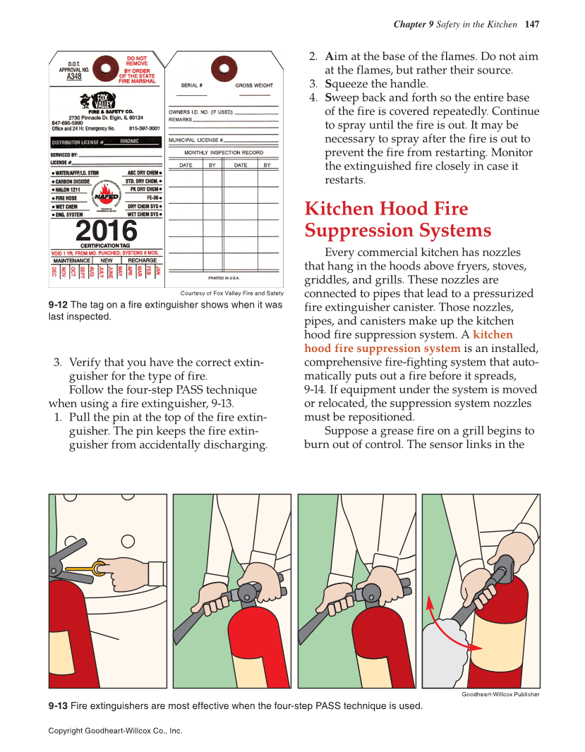 Chapter 9 Safety in the Kitchen 147 Copyright Goodheart-Willcox Co., Inc. 3. Verify that you have the correct extin- guisher for the type of fire. Follow the four-step PASS technique when using a fire extinguisher, 9-13. 1. Pull the pin at the top of the fire extin- guisher. The pin keeps the fire extin- guisher from accidentally discharging. 2. Aim at the base of the flames. Do not aim at the flames, but rather their source. 3. Squeeze the handle. 4. Sweep back and forth so the entire base of the fire is covered repeatedly. Continue to spray until the fire is out. It may be necessary to spray after the fire is out to prevent the fire from restarting. Monitor the extinguished fire closely in case it restarts. Kitchen Hood Fire Suppression Systems Every commercial kitchen has nozzles that hang in the hoods above fryers, stoves, griddles, and grills. These nozzles are connected to pipes that lead to a pressurized fire extinguisher canister. Those nozzles, pipes, and canisters make up the kitchen hood fire suppression system. A kitchen hood fire suppression system is an installed, comprehensive fire-fighting system that auto- matically puts out a fire before it spreads, 9-14. If equipment under the system is moved or relocated, the suppression system nozzles must be repositioned. Suppose a grease fire on a grill begins to burn out of control. The sensor links in the Courtesy of Fox Valley Fire and Safety 9-12 The tag on a fire extinguisher shows when it was last inspected. Goodheart-Willcox Publisher 9-13 Fire extinguishers are most effective when the four-step PASS technique is used. 2016