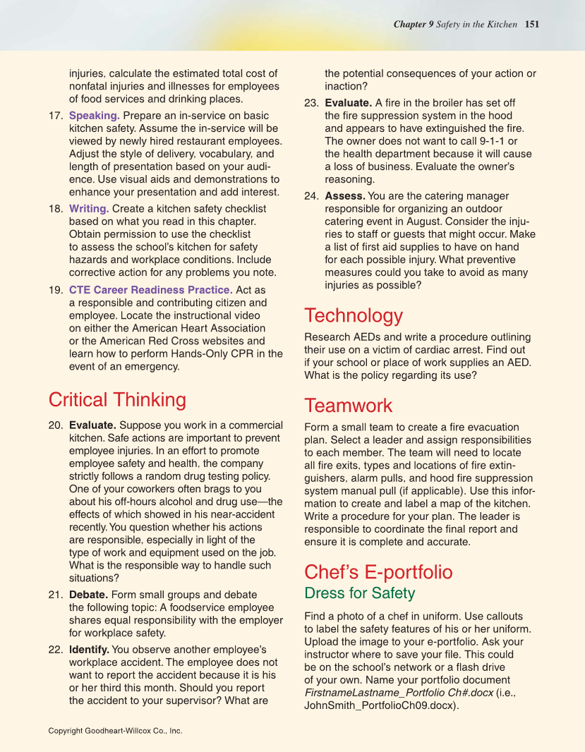 Chapter 9 Safety in the Kitchen 151 Copyright Goodheart-Willcox Co., Inc. injuries, calculate the estimated total cost of nonfatal injuries and illnesses for employees of food services and drinking places. 17. Speaking. Prepare an in-service on basic kitchen safety. Assume the in-service will be viewed by newly hired restaurant employees. Adjust the style of delivery, vocabulary, and length of presentation based on your audi- ence. Use visual aids and demonstrations to enhance your presentation and add interest. 18. Writing. Create a kitchen safety checklist based on what you read in this chapter. Obtain permission to use the checklist to assess the school’s kitchen for safety hazards and workplace conditions. Include corrective action for any problems you note. 19. CTE Career Readiness Practice. Act as a responsible and contributing citizen and employee. Locate the instructional video on either the American Heart Association or the American Red Cross websites and learn how to perform Hands-Only CPR in the event of an emergency. Critical Thinking 20. Evaluate. Suppose you work in a commercial kitchen. Safe actions are important to prevent employee injuries. In an effort to promote employee safety and health, the company strictly follows a random drug testing policy. One of your coworkers often brags to you about his off-hours alcohol and drug use—the effects of which showed in his near-accident recently. You question whether his actions are responsible, especially in light of the type of work and equipment used on the job. What is the responsible way to handle such situations? 21. Debate. Form small groups and debate the following topic: A foodservice employee shares equal responsibility with the employer for workplace safety. 22. Identify. You observe another employee’s workplace accident. The employee does not want to report the accident because it is his or her third this month. Should you report the accident to your supervisor? What are the potential consequences of your action or inaction? 23. Evaluate. A fire in the broiler has set off the fire suppression system in the hood and appears to have extinguished the fire. The owner does not want to call 9-1-1 or the health department because it will cause a loss of business. Evaluate the owner’s reasoning. 24. Assess. You are the catering manager responsible for organizing an outdoor catering event in August. Consider the inju- ries to staff or guests that might occur. Make a list of first aid supplies to have on hand for each possible injury. What preventive measures could you take to avoid as many injuries as possible? Technology Research AEDs and write a procedure outlining their use on a victim of cardiac arrest. Find out if your school or place of work supplies an AED. What is the policy regarding its use? Teamwork Form a small team to create a fire evacuation plan. Select a leader and assign responsibilities to each member. The team will need to locate all fire exits, types and locations of fire extin- guishers, alarm pulls, and hood fire suppression system manual pull (if applicable). Use this infor- mation to create and label a map of the kitchen. Write a procedure for your plan. The leader is responsible to coordinate the final report and ensure it is complete and accurate. Chef’s E-portfolio Dress for Safety Find a photo of a chef in uniform. Use callouts to label the safety features of his or her uniform. Upload the image to your e-portfolio. Ask your instructor where to save your file. This could be on the school’s network or a flash drive of your own. Name your portfolio document FirstnameLastname_Portfolio Ch#.docx (i.e., JohnSmith_PortfolioCh09.docx).