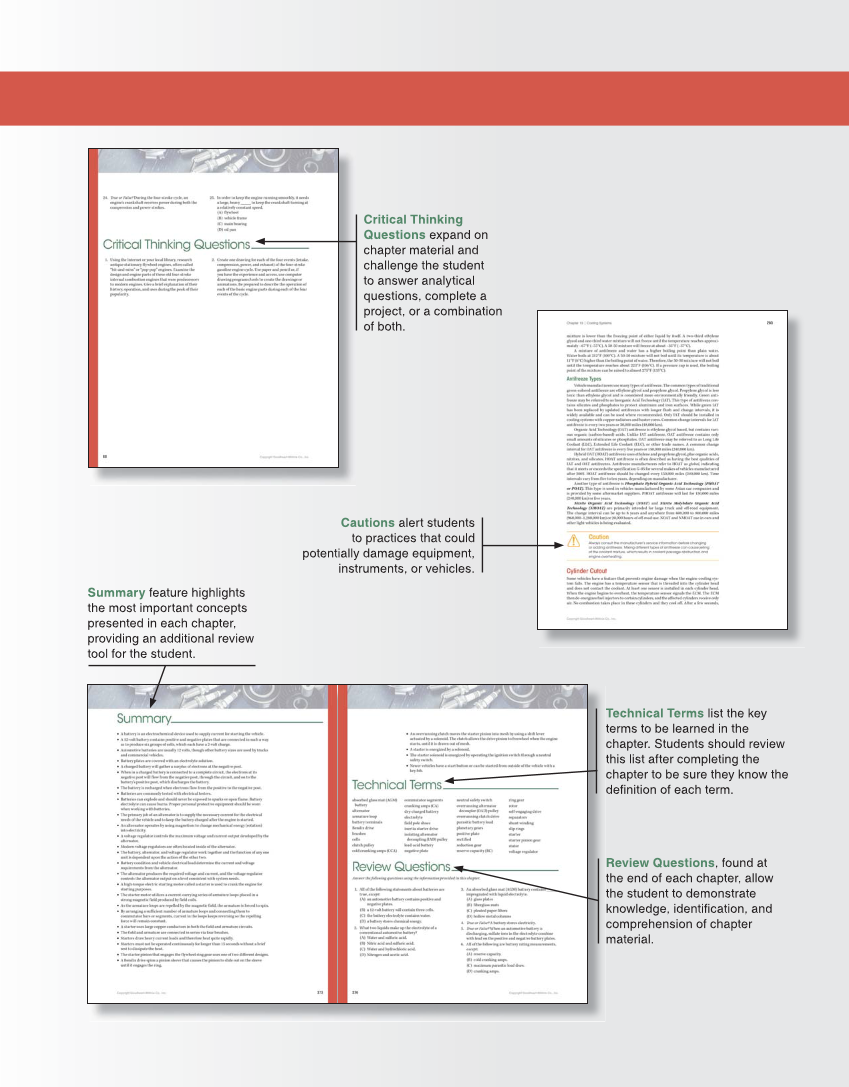 Cautions alert students to practices that could potentially damage equipment, instruments, or vehicles. Summary feature highlights the most important concepts presented in each chapter, providing an additional review tool for the student. Technical Terms list the key terms to be learned in the chapter. Students should review this list after completing the chapter to be sure they know the definition of each term. Review Questions, found at the end of each chapter, allow the student to demonstrate knowledge, identification, and comprehension of chapter material. Critical Thinking Questions expand on chapter material and challenge the student to answer analytical questions, complete a project, or a combination of both.