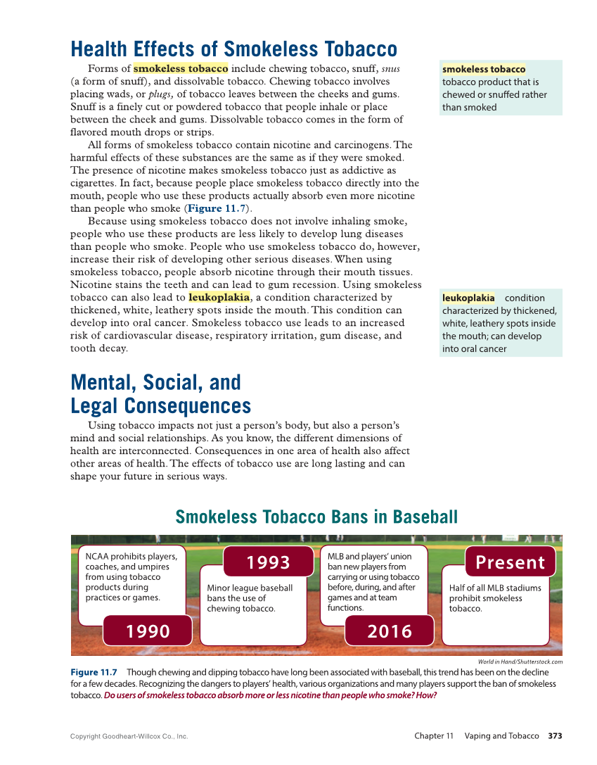 Health Effects of Smokeless Tobacco Forms of smokeless tobacco include chewing tobacco, snuff, snus (a form of snuff), and dissolvable tobacco. Chewing tobacco involves placing wads, or plugs, of tobacco leaves between the cheeks and gums. Snuff is a finely cut or powdered tobacco that people inhale or place between the cheek and gums. Dissolvable tobacco comes in the form of flavored mouth drops or strips. All forms of smokeless tobacco contain nicotine and carcinogens. The harmful effects of these substances are the same as if they were smoked. The presence of nicotine makes smokeless tobacco just as addictive as cigarettes. In fact, because people place smokeless tobacco directly into the mouth, people who use these products actually absorb even more nicotine than people who smoke (Figure 11.7). Because using smokeless tobacco does not involve inhaling smoke, people who use these products are less likely to develop lung diseases than people who smoke. People who use smokeless tobacco do, however, increase their risk of developing other serious diseases. When using smokeless tobacco, people absorb nicotine through their mouth tissues. Nicotine stains the teeth and can lead to gum recession. Using smokeless tobacco can also lead to leukoplakia, a condition characterized by thickened, white, leathery spots inside the mouth. This condition can develop into oral cancer. Smokeless tobacco use leads to an increased risk of cardiovascular disease, respiratory irritation, gum disease, and tooth decay. Mental, Social, and Legal Consequences Using tobacco impacts not just a person’s body, but also a person’s mind and social relationships. As you know, the different dimensions of health are interconnected. Consequences in one area of health also affect other areas of health. The effects of tobacco use are long lasting and can shape your future in serious ways. smokeless tobacco tobacco product that is chewed or snuffed rather than smoked leukoplakia condition characterized by thickened, white, leathery spots inside the mouth can develop into oral cancer Smokeless Tobacco Bans in Baseball NCAA prohibits players, coaches, and umpires from using tobacco products during practices or games. 1990 Minor league baseball bans the use of chewing tobacco. 1993 MLB and players’ union ban new players from carrying or using tobacco before, during, and after games and at team functions. 2016 Half of all MLB stadiums prohibit smokeless tobacco. Present World in Hand/Shutterstock.com Figure 11.7 Though chewing and dipping tobacco have long been associated with baseball, this trend has been on the decline for a few decades. Recognizing the dangers to players’ health, various organizations and many players support the ban of smokeless tobacco. Do users of smokeless tobacco absorb more or less nicotine than people who smoke? How? Copyright Goodheart-Willcox Co., Inc. Chapter 11 Vaping and Tobacco 373