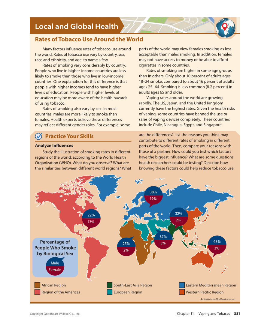 Local and Global Health Rates of Tobacco Use Around the World Many factors influence rates of tobacco use around the world. Rates of tobacco use vary by country, sex, race and ethnicity, and age, to name a few. Rates of smoking vary considerably by country. People who live in higher-income countries are less likely to smoke than those who live in low-income countries. One explanation for this difference is that people with higher incomes tend to have higher levels of education. People with higher levels of education may be more aware of the health hazards of using tobacco. Rates of smoking also vary by sex. In most countries, males are more likely to smoke than females. Health experts believe these differences may reflect different gender roles. For example, some parts of the world may view females smoking as less acceptable than males smoking. In addition, females may not have access to money or be able to afford cigarettes in some countries. Rates of smoking are higher in some age groups than in others. Only about 10 percent of adults ages 18–24 smoke, compared to about 16 percent of adults ages 25–64. Smoking is less common (8.2 percent) in adults ages 65 and older. Vaping rates around the world are growing rapidly. The US, Japan, and the United Kingdom currently have the highest rates. Given the health risks of vaping, some countries have banned the use or sales of vaping devices completely. These countries include Chile, Nicaragua, Egypt, and Singapore. Practice Your Skills Analyze Influences Study the illustration of smoking rates in different regions of the world, according to the World Health Organization (WHO). What do you observe? What are the similarities between different world regions? What are the differences? List the reasons you think may contribute to different rates of smoking in different parts of the world. Then, compare your reasons with those of a partner. How could you test which factors have the biggest influence? What are some questions health researchers could be testing? Describe how knowing these factors could help reduce tobacco use. Andrei Minsk/Shutterstock.com African Region Region of the Americas South-East Asia Region European Region Eastern Mediterranean Region Western Pacific Region Percentage of People Who Smoke by Biological Sex Female Male 13% 22% 19% 38% 2% 32% 3% 48% 3% 37% 2% 25% Copyright Goodheart-Willcox Co., Inc. Chapter 11 Vaping and Tobacco 381