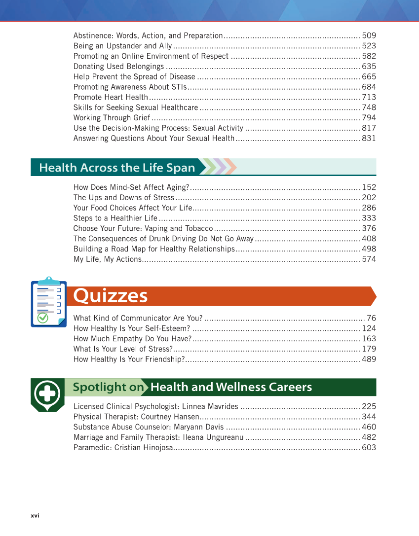 Abstinence: Words, Action, and Preparation .........................................................509 Being an Upstander and Ally ..............................................................................523 Promoting an Online Environment of Respect ......................................................582 Donating Used Belongings .................................................................................635 Help Prevent the Spread of Disease ....................................................................665 Promoting Awareness About STIs ........................................................................684 Promote Heart Health ........................................................................................713 Skills for Seeking Sexual Healthcare ...................................................................748 Working Through Grief .......................................................................................794 Use the Decision-Making Process: Sexual Activity ................................................817 Answering Questions About Your Sexual Health ....................................................831 Health Across the Life Span How Does Mind-Set Affect Aging? .......................................................................152 The Ups and Downs of Stress .............................................................................202 Your Food Choices Affect Your Life......................................................................286 Steps to a Healthier Life ....................................................................................333 Choose Your Future: Vaping and Tobacco .............................................................376 The Consequences of Drunk Driving Do Not Go Away ............................................408 Building a Road Map for Healthy Relationships ....................................................498 My Life, My Actions ...........................................................................................574 Quizzes What Kind of Communicator Are You? ...................................................................76 How Healthy Is Your Self-Esteem? ......................................................................124 How Much Empathy Do You Have? ......................................................................163 What Is Your Level of Stress? ..............................................................................179 How Healthy Is Your Friendship?.........................................................................489 Spotlight on Health and Wellness Careers Licensed Clinical Psychologist: Linnea Mavrides ..................................................225 Physical Therapist: Courtney Hansen...................................................................344 Substance Abuse Counselor: Maryann Davis ........................................................460 Marriage and Family Therapist: Ileana Ungureanu ................................................482 Paramedic: Cristian Hinojosa..............................................................................603 xvi
