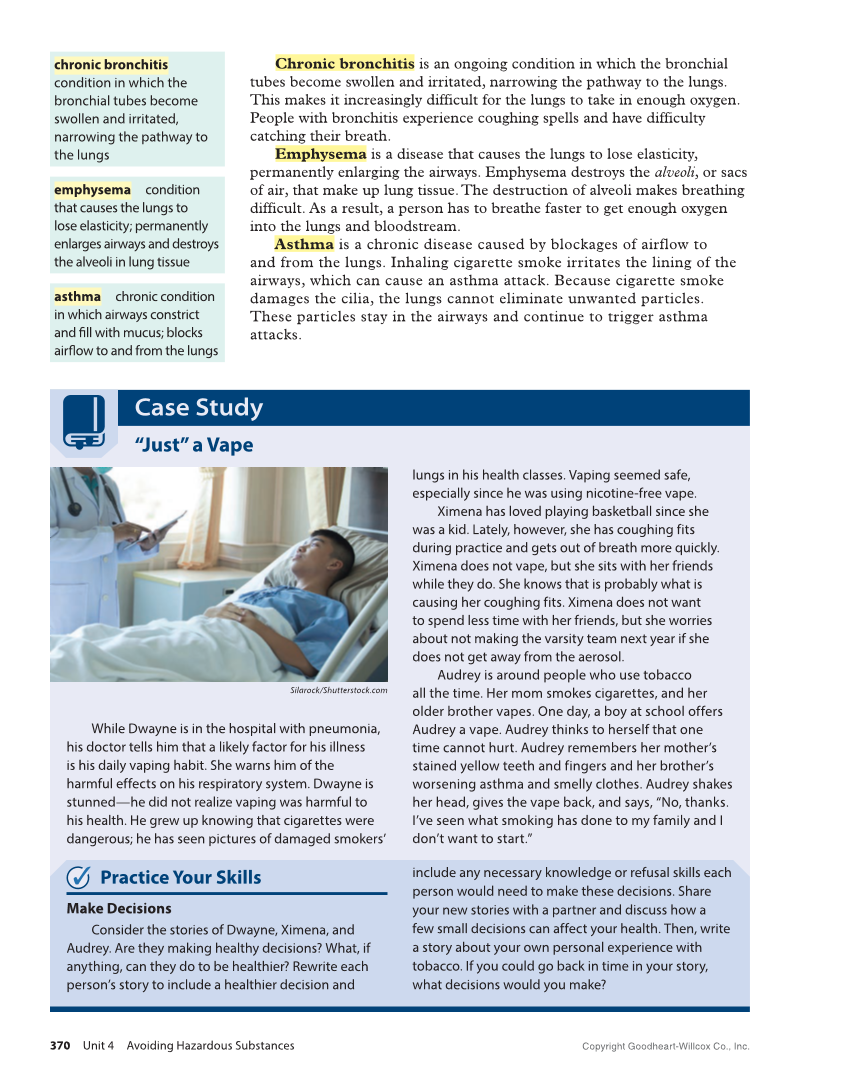 Chronic bronchitis is an ongoing condition in which the bronchial tubes become swollen and irritated, narrowing the pathway to the lungs. This makes it increasingly difficult for the lungs to take in enough oxygen. People with bronchitis experience coughing spells and have difficulty catching their breath. Emphysema is a disease that causes the lungs to lose elasticity, permanently enlarging the airways. Emphysema destroys the alveoli, or sacs of air, that make up lung tissue. The destruction of alveoli makes breathing difficult. As a result, a person has to breathe faster to get enough oxygen into the lungs and bloodstream. Asthma is a chronic disease caused by blockages of airflow to and from the lungs. Inhaling cigarette smoke irritates the lining of the airways, which can cause an asthma attack. Because cigarette smoke damages the cilia, the lungs cannot eliminate unwanted particles. These particles stay in the airways and continue to trigger asthma attacks. chronic bronchitis condition in which the bronchial tubes become swollen and irritated, narrowing the pathway to the lungs emphysema condition that causes the lungs to lose elasticity permanently enlarges airways and destroys the alveoli in lung tissue asthma chronic condition in which airways constrict and fill with mucus blocks airflow to and from the lungs Case Study “Just” a Vape While Dwayne is in the hospital with pneumonia, his doctor tells him that a likely factor for his illness is his daily vaping habit. She warns him of the harmful effects on his respiratory system. Dwayne is stunned—he did not realize vaping was harmful to his health. He grew up knowing that cigarettes were dangerous he has seen pictures of damaged smokers’ Practice Your Skills Make Decisions Consider the stories of Dwayne, Ximena, and Audrey. Are they making healthy decisions? What, if anything, can they do to be healthier? Rewrite each person’s story to include a healthier decision and include any necessary knowledge or refusal skills each person would need to make these decisions. Share your new stories with a partner and discuss how a few small decisions can affect your health. Then, write a story about your own personal experience with tobacco. If you could go back in time in your story, what decisions would you make? lungs in his health classes. Vaping seemed safe, especially since he was using nicotine-free vape. Ximena has loved playing basketball since she was a kid. Lately, however, she has coughing fits during practice and gets out of breath more quickly. Ximena does not vape, but she sits with her friends while they do. She knows that is probably what is causing her coughing fits. Ximena does not want to spend less time with her friends, but she worries about not making the varsity team next year if she does not get away from the aerosol. Audrey is around people who use tobacco all the time. Her mom smokes cigarettes, and her older brother vapes. One day, a boy at school offers Audrey a vape. Audrey thinks to herself that one time cannot hurt. Audrey remembers her mother’s stained yellow teeth and fingers and her brother’s worsening asthma and smelly clothes. Audrey shakes her head, gives the vape back, and says, “No, thanks. I’ve seen what smoking has done to my family and I don’t want to start.” Silarock/Shutterstock.com Copyright Goodheart-Willcox Co., Inc. 370 Unit 4 Avoiding Hazardous Substances