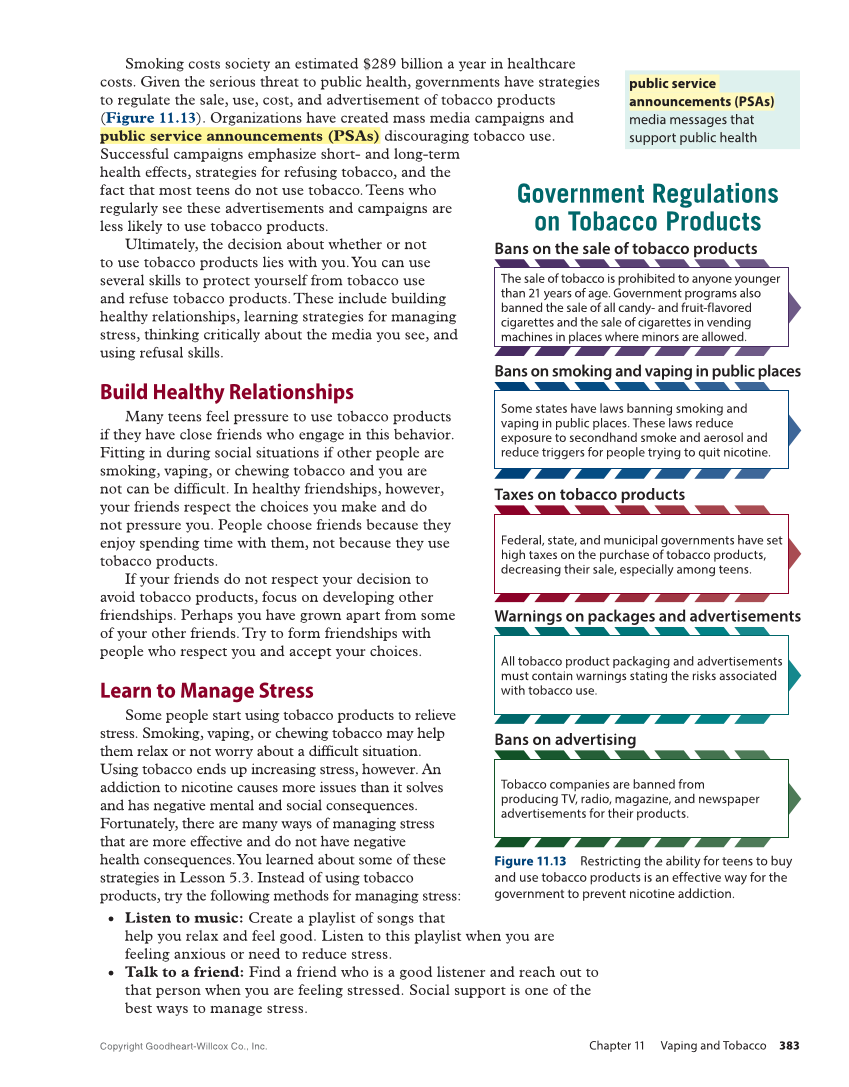 Smoking costs society an estimated $289 billion a year in healthcare costs. Given the serious threat to public health, governments have strategies to regulate the sale, use, cost, and advertisement of tobacco products (Figure 11.13). Organizations have created mass media campaigns and public service announcements (PSAs) discouraging tobacco use. Successful campaigns emphasize short- and long-term health effects, strategies for refusing tobacco, and the fact that most teens do not use tobacco. Teens who regularly see these advertisements and campaigns are less likely to use tobacco products. Ultimately, the decision about whether or not to use tobacco products lies with you. You can use several skills to protect yourself from tobacco use and refuse tobacco products. These include building healthy relationships, learning strategies for managing stress, thinking critically about the media you see, and using refusal skills. Build Healthy Relationships Many teens feel pressure to use tobacco products if they have close friends who engage in this behavior. Fitting in during social situations if other people are smoking, vaping, or chewing tobacco and you are not can be difficult. In healthy friendships, however, your friends respect the choices you make and do not pressure you. People choose friends because they enjoy spending time with them, not because they use tobacco products. If your friends do not respect your decision to avoid tobacco products, focus on developing other friendships. Perhaps you have grown apart from some of your other friends. Try to form friendships with people who respect you and accept your choices. Learn to Manage Stress Some people start using tobacco products to relieve stress. Smoking, vaping, or chewing tobacco may help them relax or not worry about a difficult situation. Using tobacco ends up increasing stress, however. An addiction to nicotine causes more issues than it solves and has negative mental and social consequences. Fortunately, there are many ways of managing stress that are more effective and do not have negative health consequences. You learned about some of these strategies in Lesson 5.3. Instead of using tobacco products, try the following methods for managing stress: ● ● Listen to music: Create a playlist of songs that help you relax and feel good. Listen to this playlist when you are feeling anxious or need to reduce stress. ● ● Talk to a friend: Find a friend who is a good listener and reach out to that person when you are feeling stressed. Social support is one of the best ways to manage stress. public service announcements (PSAs) media messages that support public health Government Regulations on Tobacco Products The sale of tobacco is prohibited to anyone younger than 21 years of age. Government programs also banned the sale of all candy- and fruit-flavored cigarettes and the sale of cigarettes in vending machines in places where minors are allowed. Bans on the sale of tobacco products Some states have laws banning smoking and vaping in public places. These laws reduce exposure to secondhand smoke and aerosol and reduce triggers for people trying to quit nicotine. Bans on smoking and vaping in public places Federal, state, and municipal governments have set high taxes on the purchase of tobacco products, decreasing their sale, especially among teens. Taxes on tobacco products All tobacco product packaging and advertisements must contain warnings stating the risks associated with tobacco use. Warnings on packages and advertisements Tobacco companies are banned from producing TV, radio, magazine, and newspaper advertisements for their products. Bans on advertising Figure 11.13 Restricting the ability for teens to buy and use tobacco products is an effective way for the government to prevent nicotine addiction. Copyright Goodheart-Willcox Co., Inc. Chapter 11 Vaping and Tobacco 383