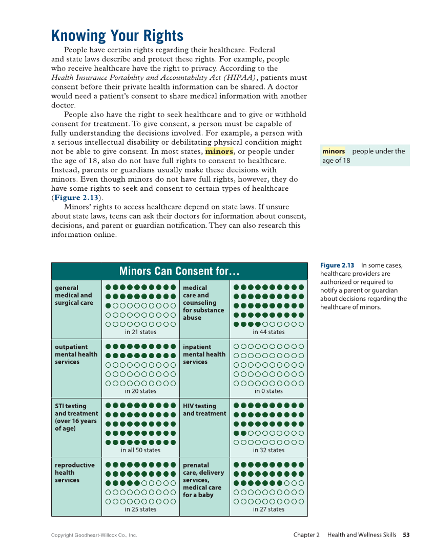 Knowing Your Rights People have certain rights regarding their healthcare. Federal and state laws describe and protect these rights. For example, people who receive healthcare have the right to privacy. According to the Health Insurance Portability and Accountability Act (HIPAA), patients must consent before their private health information can be shared. A doctor would need a patient’s consent to share medical information with another doctor. People also have the right to seek healthcare and to give or withhold consent for treatment. To give consent, a person must be capable of fully understanding the decisions involved. For example, a person with a serious intellectual disability or debilitating physical condition might not be able to give consent. In most states, minors, or people under the age of 18, also do not have full rights to consent to healthcare. Instead, parents or guardians usually make these decisions with minors. Even though minors do not have full rights, however, they do have some rights to seek and consent to certain types of healthcare (Figure 2.13). Minors’ rights to access healthcare depend on state laws. If unsure about state laws, teens can ask their doctors for information about consent, decisions, and parent or guardian notification. They can also research this information online. minors people under the age of 18 Minors Can Consent for… general medical and surgical care ● ● ● ● ● ● ● ● ● ● ● ● ● ● ● ● ● ● ● ● ● in 21 states medical care and counseling for substance abuse ● ● ● ● ● ● ● ● ● ● ● ● ● ● ● ● ● ● ● ● ● ● ● ● ● ● ● ● ● ● ● ● ● ● ● ● ● ● ● ● ● ● ● ● in 44 states outpatient mental health services ● ● ● ● ● ● ● ● ● ● ● ● ● ● ● ● ● ● ● ● in 20 states inpatient mental health services in 0 states STI testing and treatment (over 16 years of age) ● ● ● ● ● ● ● ● ● ● ● ● ● ● ● ● ● ● ● ● ● ● ● ● ● ● ● ● ● ● ● ● ● ● ● ● ● ● ● ● ● ● ● ● ● ● ● ● ● ● in all 50 states HIV testing and treatment ● ● ● ● ● ● ● ● ● ● ● ● ● ● ● ● ● ● ● ● ● ● ● ● ● ● ● ● ● ● ● ● in 32 states reproductive health services ● ● ● ● ● ● ● ● ● ● ● ● ● ● ● ● ● ● ● ● ● ● ● ● ● in 25 states prenatal care, delivery services, medical care for a baby ● ● ● ● ● ● ● ● ● ● ● ● ● ● ● ● ● ● ● ● ● ● ● ● ● ● ● in 27 states Figure 2.13 In some cases, healthcare providers are authorized or required to notify a parent or guardian about decisions regarding the healthcare of minors. Copyright Goodheart-Willcox Co., Inc. Chapter 2 Health and Wellness Skills 53