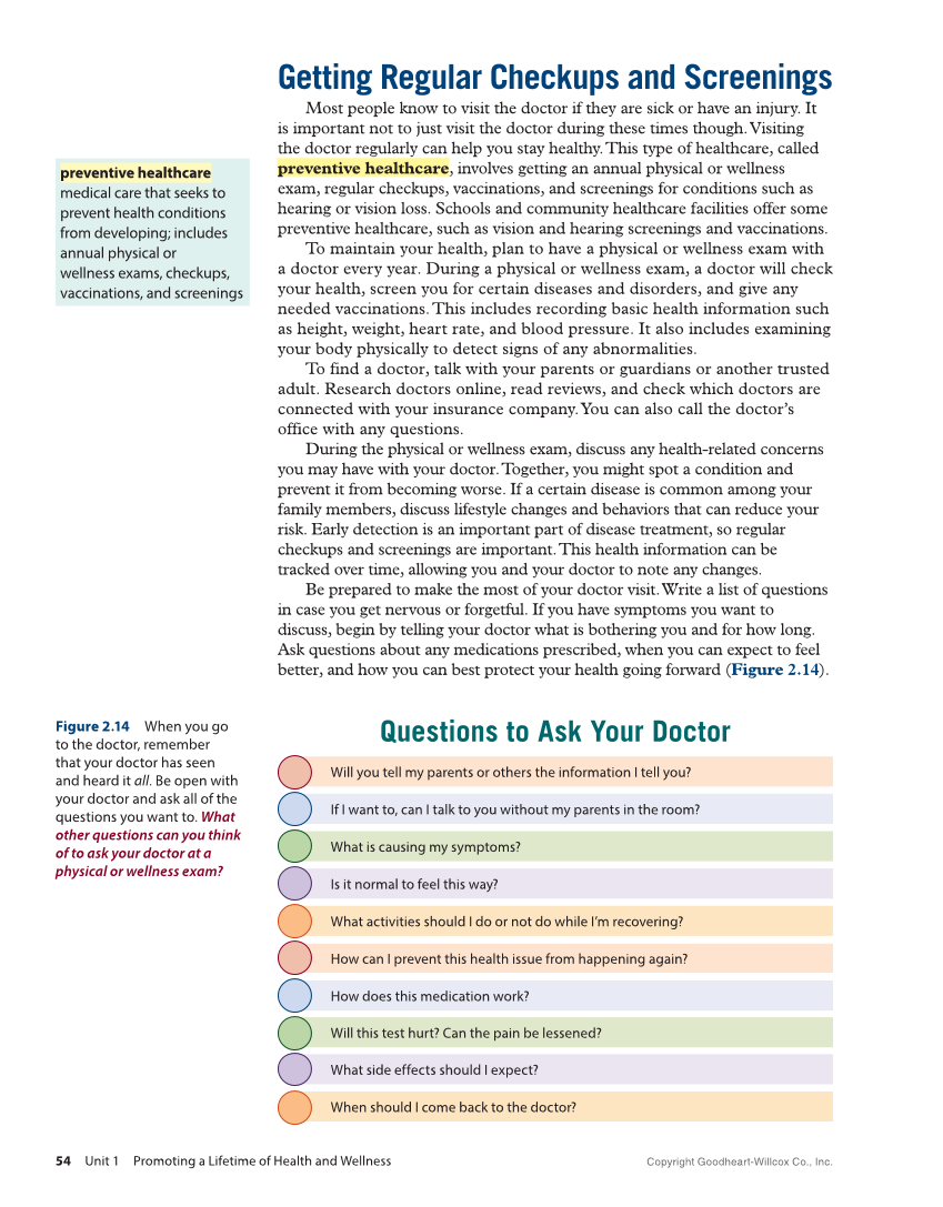 Getting Regular Checkups and Screenings Most people know to visit the doctor if they are sick or have an injury. It is important not to just visit the doctor during these times though. Visiting the doctor regularly can help you stay healthy. This type of healthcare, called preventive healthcare, involves getting an annual physical or wellness exam, regular checkups, vaccinations, and screenings for conditions such as hearing or vision loss. Schools and community healthcare facilities offer some preventive healthcare, such as vision and hearing screenings and vaccinations. To maintain your health, plan to have a physical or wellness exam with a doctor every year. During a physical or wellness exam, a doctor will check your health, screen you for certain diseases and disorders, and give any needed vaccinations. This includes recording basic health information such as height, weight, heart rate, and blood pressure. It also includes examining your body physically to detect signs of any abnormalities. To find a doctor, talk with your parents or guardians or another trusted adult. Research doctors online, read reviews, and check which doctors are connected with your insurance company. You can also call the doctor’s office with any questions. During the physical or wellness exam, discuss any health-related concerns you may have with your doctor. Together, you might spot a condition and prevent it from becoming worse. If a certain disease is common among your family members, discuss lifestyle changes and behaviors that can reduce your risk. Early detection is an important part of disease treatment, so regular checkups and screenings are important. This health information can be tracked over time, allowing you and your doctor to note any changes. Be prepared to make the most of your doctor visit. Write a list of questions in case you get nervous or forgetful. If you have symptoms you want to discuss, begin by telling your doctor what is bothering you and for how long. Ask questions about any medications prescribed, when you can expect to feel better, and how you can best protect your health going forward (Figure 2.14). preventive healthcare medical care that seeks to prevent health conditions from developing includes annual physical or wellness exams, checkups, vaccinations, and screenings Questions to Ask Your Doctor Will you tell my parents or others the information I tell you? If I want to, can I talk to you without my parents in the room? What is causing my symptoms? Is it normal to feel this way? What activities should I do or not do while I’m recovering? How can I prevent this health issue from happening again? How does this medication work? Will this test hurt? Can the pain be lessened? What side effects should I expect? When should I come back to the doctor? Figure 2.14 When you go to the doctor, remember that your doctor has seen and heard it all. Be open with your doctor and ask all of the questions you want to. What other questions can you think of to ask your doctor at a physical or wellness exam? Copyright Goodheart-Willcox Co., Inc. 54 Unit 1 Promoting a Lifetime of Health and Wellness