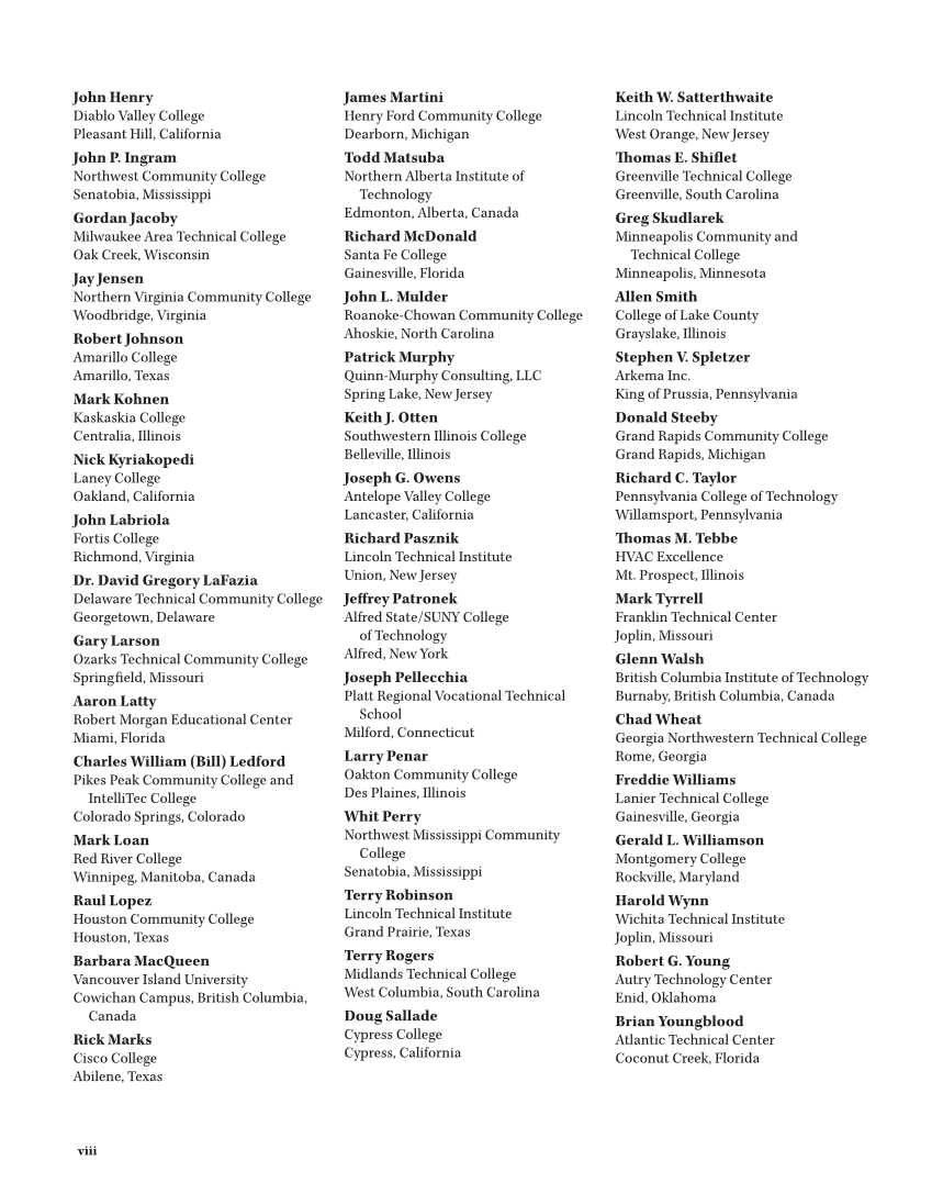 viii John Henry Diablo Valley College Pleasant Hill, California John P. Ingram Northwest Community College Senatobia, Mississippi Gordan Jacoby Milwaukee Area Technical College Oak Creek, Wisconsin Jay Jensen Northern Virginia Community College Woodbridge, Virginia Robert Johnson Amarillo College Amarillo, Texas Mark Kohnen Kaskaskia College Centralia, Illinois Nick Kyriakopedi Laney College Oakland, California John Labriola Fortis College Richmond, Virginia Dr. David Gregory LaFazia Delaware Technical Community College Georgetown, Delaware Gary Larson Ozarks Technical Community College Springfi eld, Missouri Aaron Latty Robert Morgan Educational Center Miami, Florida Charles William (Bill) Ledford Pikes Peak Community College and IntelliTec College Colorado Springs, Colorado Mark Loan Red River College Winnipeg, Manitoba, Canada Raul Lopez Houston Community College Houston, Texas Barbara MacQueen Vancouver Island University Cowichan Campus, British Columbia, Canada Rick Marks Cisco College Abilene, Texas James Martini Henry Ford Community College Dearborn, Michigan Todd Matsuba Northern Alberta Institute of Technology Edmonton, Alberta, Canada Richard McDonald Santa Fe College Gainesville, Florida John L. Mulder Roanoke-Chowan Community College Ahoskie, North Carolina Patrick Murphy Quinn-Murphy Consulting, LLC Spring Lake, New Jersey Keith J. Otten Southwestern Illinois College Belleville, Illinois Joseph G. Owens Antelope Valley College Lancaster, California Richard Pasznik Lincoln Technical Institute Union, New Jersey Jeff rey Patronek Alfred State/SUNY College of Technology Alfred, New York Joseph Pellecchia Platt Regional Vocational Technical School Milford, Connecticut Larry Penar Oakton Community College Des Plaines, Illinois Whit Perry Northwest Mississippi Community College Senatobia, Mississippi Terry Robinson Lincoln Technical Institute Grand Prairie, Texas Terry Rogers Midlands Technical College West Columbia, South Carolina Doug Sallade Cypress College Cypress, California Keith W. Satterthwaite Lincoln Technical Institute West Orange, New Jersey Th omas E. Shifl et Greenville Technical College Greenville, South Carolina Greg Skudlarek Minneapolis Community and Technical College Minneapolis, Minnesota Allen Smith College of Lake County Grayslake, Illinois Stephen V. Spletzer Arkema Inc. King of Prussia, Pennsylvania Donald Steeby Grand Rapids Community College Grand Rapids, Michigan Richard C. Taylor Pennsylvania College of Technology Willamsport, Pennsylvania Th omas M. Tebbe HVAC Excellence Mt. Prospect, Illinois Mark Tyrrell Franklin Technical Center Joplin, Missouri Glenn Walsh British Columbia Institute of Technology Burnaby, British Columbia, Canada Chad Wheat Georgia Northwestern Technical College Rome, Georgia Freddie Williams Lanier Technical College Gainesville, Georgia Gerald L. Williamson Montgomery College Rockville, Maryland Harold Wynn Wichita Technical Institute Joplin, Missouri Robert G. Young Autry Technology Center Enid, Oklahoma Brian Youngblood Atlantic Technical Center Coconut Creek, Florida