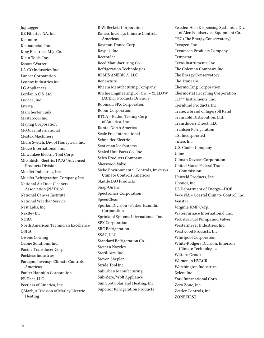 x JugLugger KE Fibertec NA, Inc. Kenmore Kennametal, Inc. King Electrical Mfg. Co. Klein Tools, Inc. Kysor//Warren LA-CO Industries Inc. Lancer Corporation Lennox Industries Inc. LG Appliances Lordan A.C.S. Ltd Ludeca, Inc. Luvata Manchester Tank Mastercool Inc. Maytag Corporation McQuay International Mestek Machinery Micro Switch, Div. of Honeywell, Inc. Midco International, Inc. Milwaukee Electric Tool Corp. Mitsubishi Electric, HVAC Advanced Products Division Mueller Industries, Inc. Mueller Refrigeration Company, Inc. National Air Duct Cleaners Association (NADCA) National Cancer Institute National Weather Service Nest Labs, Inc. NexRev Inc. NORA North American Technician Excellence OSHA Owens Corning Ozone Solutions, Inc. Pacifi c Transducer Corp. Packless Industries Paragon, Invensys Climate Controls Americas Parker Hannifi n Corporation PB Heat, LLC Peerless of America, Inc. QMark, A Division of Marley Electric Heating R.W. Beckett Corporation Ranco, Invensys Climate Controls Americas Raymon-Donco Corp. Raypak, Inc. RectorSeal Reed Manufacturing Co. Refrigeration Technologies REMIS AMERICA, LLC RenewAire Rheem Manufacturing Company Ritchie Engineering Co., Inc. – YELLOW JACKET Products Division Robinair, SPX Corporation Robur Corporation RTCA—Radon Testing Corp of America, Inc. Runtal North America Scale Free International Schneider Electric Scotsman Ice Systems Sealed Unit Parts Co., Inc. Selco Products Company Sherwood Valve Siebe Environmental Controls, Invensys Climate Controls Americas Skuttle IAQ Products Snap-On Inc. Spectronics Corporation SpeedClean Sporlan Division - Parker Hannifi n Corporation Sprinkool Systems International, Inc. SPX Corporation SRC Refrigeration SSAC, LLC Standard Refrigeration Co. Steinen Nozzles Steril-Aire, Inc. Steven Shepler Stride Tool Inc. Suburban Manufacturing Sub-Zero/Wolf Appliance Sun Spot Solar and Heating, Inc. Superior Refrigeration Products Sweden-Alco Dispensing Systems, a Div. of Alco Foodservice Equipment Co. TEC (Th e Energy Conservatory) Tecogen, Inc. Tecumseh Products Company Tempstar Texas Instruments, Inc. Th e Coleman Company, Inc. Th e Energy Conservatory Th e Trane Co. Th ermo King Corporation Th ermostat Recycling Corporation TIF™ Instruments, Inc. Tjernlund Products, Inc. Trane, a brand of Ingersoll Rand Transcold Distribution, Ltd. Transducers Direct, LLC Traulsen Refrigeration TSI Incorporated Tutco, Inc. U.S. Cooler Company Uline Ullman Devices Corporation United States Federal Trade Commission Uniweld Products, Inc. Uponor, Inc. US Department of Energy—DOE Veco NA – Coastal Climate Control, Inc. Venstar Virginia KMP Corp. WaterFurnace International, Inc. Webster Fuel Pumps and Valves Westermeyer Industries, Inc. Westwood Products, Inc. Whirlpool Corporation White-Rodgers Division, Emerson Climate Technologies Wittern Group Women in HVACR Worthington Industries Xylem Inc. York International Corp. Zero Zone, Inc. Zettler Controls, Inc. ZONEFIRST