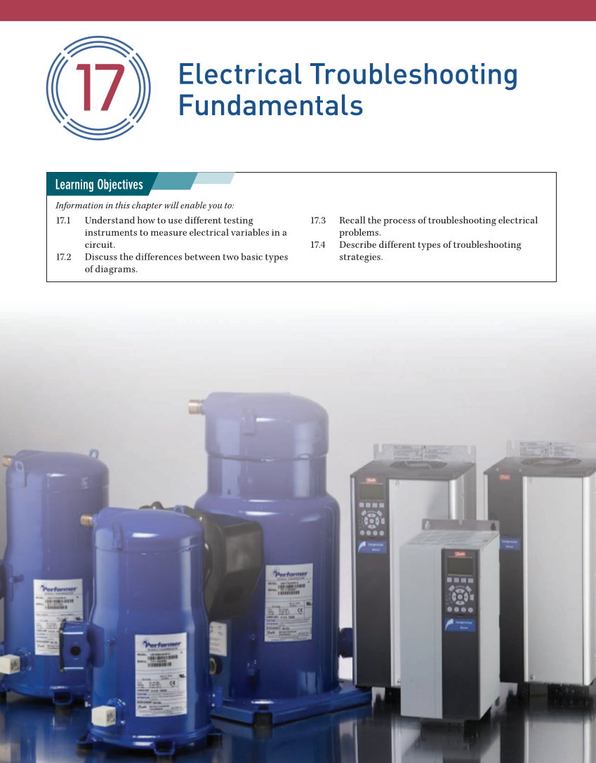 17 Electrical Troubleshooting Fundamentals Information in this chapter will enable you to: 17.1 Understand how to use different testing instruments to measure electrical variables in a circuit. 17.2 Discuss the differences between two basic types of diagrams. 17.3 Recall the process of troubleshooting electrical problems. 17.4 Describe different types of troubleshooting strategies. Learning Objectives