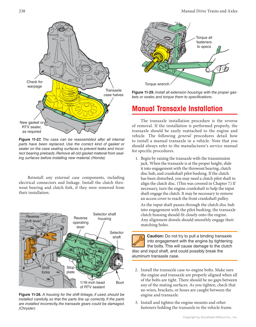 238 Manual Drive Trains and Axles Copyright by Goodheart-Willcox Co., Inc. Manual Transaxle Installation The transaxle installation procedure is the reverse of removal. If the installation is performed properly, the transaxle should be easily reattached to the engine and vehicle. The following general procedures detail how to install a manual transaxle in a vehicle. Note that you should always refer to the manufacturer’s service manual for specific procedures. 1. Begin by raising the transaxle with the transmission jack. When the transaxle is at the proper height, slide it into engagement with the throwout bearing, clutch disc hub, and crankshaft pilot bushing. If the clutch has been disturbed, you may need a clutch pilot shaft to align the clutch disc. (This was covered in Chapter 7.) If necessary, turn the engine crankshaft to help the input shaft engage the clutch. It may be necessary to remove an access cover to reach the front crankshaft pulley. As the input shaft passes through the clutch disc hub into engagement with the pilot bushing, the transaxle clutch housing should fit closely onto the engine. Any alignment dowels should smoothly engage their matching holes. Caution: Do not try to pull a binding transaxle into engagement with the engine by tightening the bolts. This will cause damage to the clutch disc and input shaft, and could possibly break the aluminum transaxle case. 2. Install the transaxle case-to-engine bolts. Make sure the engine and transaxle are properly aligned when all of the bolts are tight. There should be no gaps between any of the mating surfaces. As you tighten, check that no wires, brackets, or hoses are caught between the engine and transaxle. 3. Install and tighten the engine mounts and other fasteners holding the transaxle to the vehicle frame. Check for warpage New gasket or RTV sealer, as required Transaxle case halves Reverse shift lever Reverse operating lever Selector shaft housing Selector shaft Boot 1/16-inch bead of RTV sealant Stop plate Shift forks Torque wrench Torque all fasteners to specs Figure 11-28. A housing for the shift linkage, if used, should be installed carefully, so that the parts line up correctly. If the parts are installed incorrectly, the transaxle gears could be damaged. (Chrysler) Figure 11-29. Install all extension housings with the proper gas- kets or sealer, and torque them to specifications. Figure 11-27. The case can be reassembled after all internal parts have been replaced. Use the correct kind of gasket or sealer on the case sealing surfaces to prevent leaks and incor- rect bearing preloads. Remove all old gasket material from seal- ing surfaces before installing new material. (Honda) Reinstall any external case components, including electrical connectors and linkage. Install the clutch thro- wout bearing and clutch fork, if they were removed from their installation.