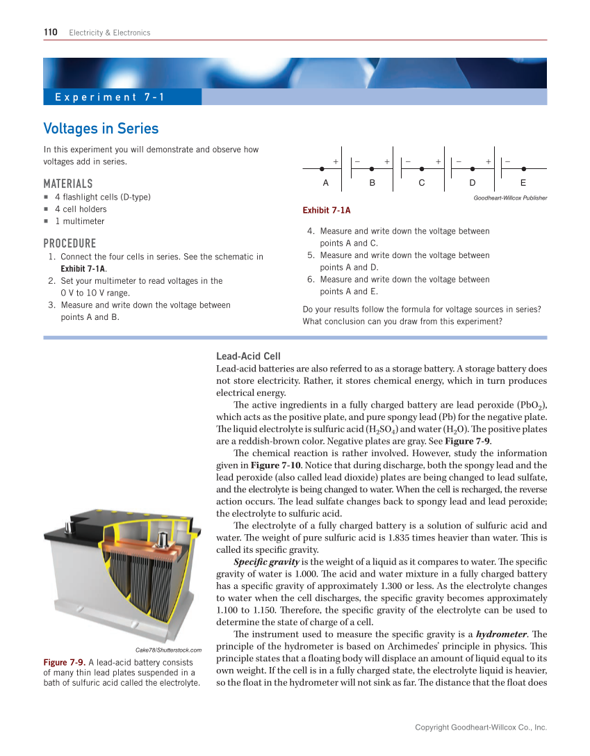 110 Electricity & Electronics Lead-Acid Cell Lead-acid batteries are also referred to as a storage battery. A storage battery does not store electricity. Rather, it stores chemical energy, which in turn produces electrical energy. Th e active ingredients in a fully charged battery are lead peroxide (PbO2), which acts as the positive plate, and pure spongy lead (Pb) for the negative plate. Th e liquid electrolyte is sulfuric acid (H2SO4) and water (H2O). Th e positive plates are a reddish-brown color. Negative plates are gray. See Figure 7-9. Th e chemical reaction is rather involved. However, study the information given in Figure 7-10. Notice that during discharge, both the spongy lead and the lead peroxide (also called lead dioxide) plates are being changed to lead sulfate, and the electrolyte is being changed to water. When the cell is recharged, the reverse action occurs. Th e lead sulfate changes back to spongy lead and lead peroxide the electrolyte to sulfuric acid. Th e electrolyte of a fully charged battery is a solution of sulfuric acid and water. Th e weight of pure sulfuric acid is 1.835 times heavier than water. Th is is called its specifi c gravity. Specifi c gravity is the weight of a liquid as it compares to water. Th e specifi c gravity of water is 1.000. Th e acid and water mixture in a fully charged battery has a specifi c gravity of approximately 1.300 or less. As the electrolyte changes to water when the cell discharges, the specifi c gravity becomes approximately 1.100 to 1.150. Th erefore, the specifi c gravity of the electrolyte can be used to determine the state of charge of a cell. Th e instrument used to measure the specifi c gravity is a hydrometer. Th e principle of the hydrometer is based on Archimedes’ principle in physics. Th is principle states that a fl oating body will displace an amount of liquid equal to its own weight. If the cell is in a fully charged state, the electrolyte liquid is heavier, so the fl oat in the hydrometer will not sink as far. Th e distance that the fl oat does Voltages in Series In this experiment you will demonstrate and observe how voltages add in series. MATERIALS ■ 4 fl ashlight cells (D-type) ■ 4 cell holders ■ 1 multimeter PROCEDURE 1. Connect the four cells in series. See the schematic in Exhibit 7-1A. 2. Set your multimeter to read voltages in the 0 V to 10 V range. 3. Measure and write down the voltage between points A and B. 4. Measure and write down the voltage between points A and C. 5. Measure and write down the voltage between points A and D. 6. Measure and write down the voltage between points A and E. Do your results follow the formula for voltage sources in series? What conclusion can you draw from this experiment? E x p e r i m e n t 7 - 1 A B C D E − + + − + − + − Goodheart-Willcox Publisher Exhibit 7-1A Cake78/Shutterstock.com Figure 7-9. A lead-acid battery consists of many thin lead plates suspended in a bath of sulfuric acid called the electrolyte. Copyright Goodheart-Willcox Co., Inc.