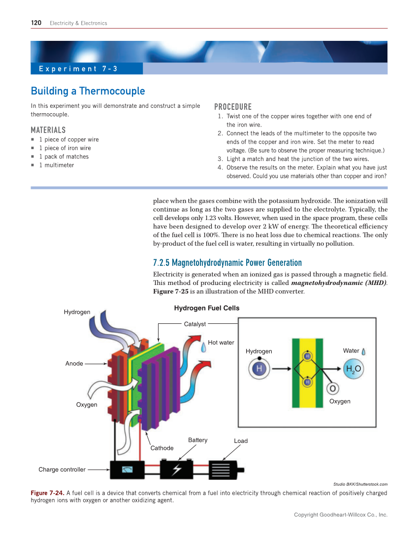 120 Electricity & Electronics place when the gases combine with the potassium hydroxide. Th e ionization will continue as long as the two gases are supplied to the electrolyte. Typically, the cell develops only 1.23 volts. However, when used in the space program, these cells have been designed to develop over 2 kW of energy. Th e theoretical effi ciency of the fuel cell is 100%. Th ere is no heat loss due to chemical reactions. Th e only by-product of the fuel cell is water, resulting in virtually no pollution. 7.2.5 Magnetohydrodynamic Power Generation Electricity is generated when an ionized gas is passed through a magnetic fi eld. Th is method of producing electricity is called magnetohydrodynamic (MHD). Figure 7-25 is an illustration of the MHD converter. Building a Thermocouple In this experiment you will demonstrate and construct a simple thermocouple. MATERIALS ■ 1 piece of copper wire ■ 1 piece of iron wire ■ 1 pack of matches ■ 1 multimeter PROCEDURE 1. Twist one of the copper wires together with one end of the iron wire. 2. Connect the leads of the multimeter to the opposite two ends of the copper and iron wire. Set the meter to read voltage. (Be sure to observe the proper measuring technique.) 3. Light a match and heat the junction of the two wires. 4. Observe the results on the meter. Explain what you have just observed. Could you use materials other than copper and iron? E x p e r i m e n t 7 - 3 Hydrogen Catalyst Hot water Hydrogen Water Anode Cathode Battery Load Charge controller Oxygen Oxygen Hydrogen Fuel Cells H 2 O Studio BKK/Shutterstock.com Figure 7-24. A fuel cell is a device that converts chemical from a fuel into electricity through chemical reaction of positively charged hydrogen ions with oxygen or another oxidizing agent. Copyright Goodheart-Willcox Co., Inc.