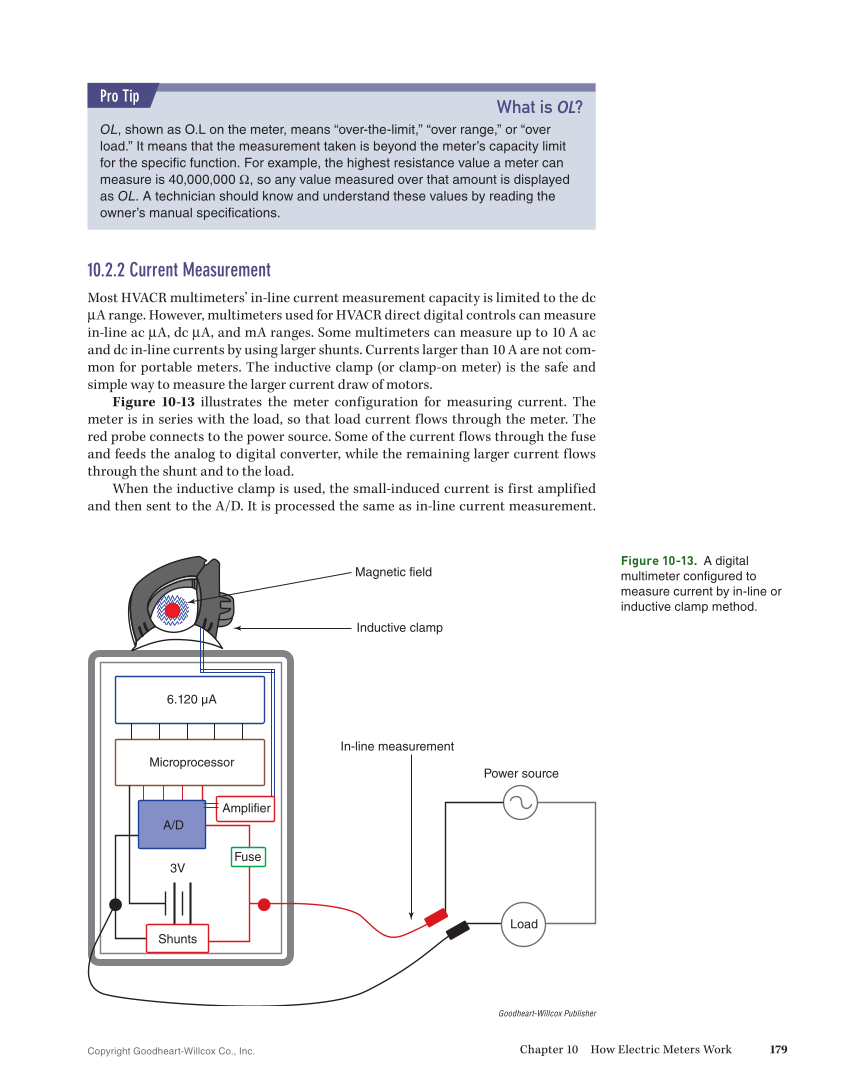 Copyright Goodheart-Willcox Co., Inc. Chapter 10 How Electric Meters Work 179 10.2.2 Current Measurement Most HVACR multimeters’ in-line current measurement capacity is limited to the dc μA range. However, multimeters used for HVACR direct digital controls can measure in-line ac μA, dc μA, and mA ranges. Some multimeters can measure up to 10 A ac and dc in-line currents by using larger shunts. Currents larger than 10 A are not com- mon for portable meters. The inductive clamp (or clamp-on meter) is the safe and simple way to measure the larger current draw of motors. Figure 10-13 illustrates the meter configuration for measuring current. The meter is in series with the load, so that load current flows through the meter. The red probe connects to the power source. Some of the current flows through the fuse and feeds the analog to digital converter, while the remaining larger current flows through the shunt and to the load. When the inductive clamp is used, the small-induced current is first amplified and then sent to the A/D. It is processed the same as in-line current measurement. What is OL? OL, shown as O.L on the meter, means “over-the-limit,” “over range,” or “over load.” It means that the measurement taken is beyond the meter’s capacity limit for the specific function. For example, the highest resistance value a meter can measure is 40,000,000 Ω, so any value measured over that amount is displayed as OL. A technician should know and understand these values by reading the owner’s manual specifications. Pro Tip Load 3V Power source In-line measurement Inductive clamp Magnetic field A/D Fuse Amplifier Microprocessor 6.120 µA Shunts Goodheart-Willcox Publisher Figure 10-13. A digital multimeter configured to measure current by in-line or inductive clamp method.