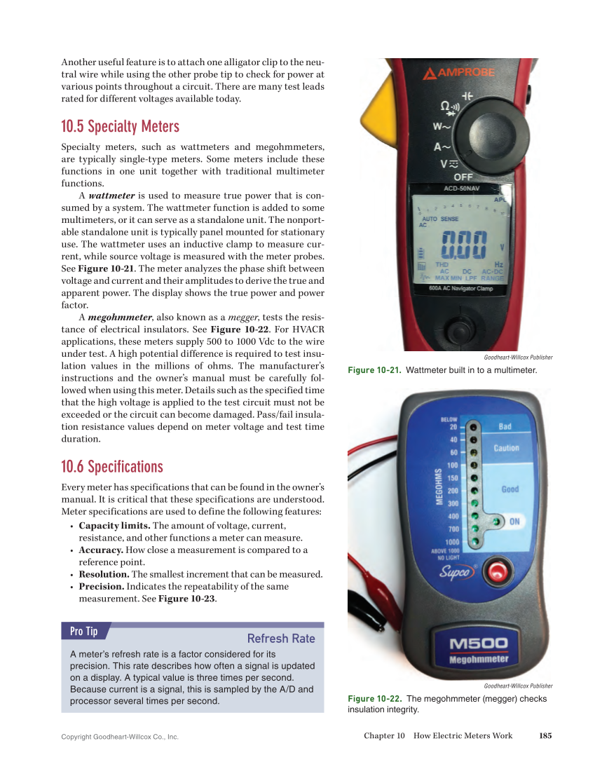 Copyright Goodheart-Willcox Co., Inc. Chapter 10 How Electric Meters Work 185 Another useful feature is to attach one alligator clip to the neu- tral wire while using the other probe tip to check for power at various points throughout a circuit. There are many test leads rated for different voltages available today. 10.5 Specialty Meters Specialty meters, such as wattmeters and megohmmeters, are typically single-type meters. Some meters include these functions in one unit together with traditional multimeter functions. A wattmeter is used to measure true power that is con- sumed by a system. The wattmeter function is added to some multimeters, or it can serve as a standalone unit. The nonport- able standalone unit is typically panel mounted for stationary use. The wattmeter uses an inductive clamp to measure cur- rent, while source voltage is measured with the meter probes. See Figure 10-21. The meter analyzes the phase shift between voltage and current and their amplitudes to derive the true and apparent power. The display shows the true power and power factor. A megohmmeter, also known as a megger, tests the resis- tance of electrical insulators. See Figure 10-22. For HVACR applications, these meters supply 500 to 1000 Vdc to the wire under test. A high potential difference is required to test insu- lation values in the millions of ohms. The manufacturer’s instructions and the owner’s manual must be carefully fol- lowed when using this meter. Details such as the specified time that the high voltage is applied to the test circuit must not be exceeded or the circuit can become damaged. Pass/fail insula- tion resistance values depend on meter voltage and test time duration. 10.6 Specifications Every meter has specifications that can be found in the owner’s manual. It is critical that these specifications are understood. Meter specifications are used to define the following features: • Capacity limits. The amount of voltage, current, resistance, and other functions a meter can measure. • Accuracy. How close a measurement is compared to a reference point. • Resolution. The smallest increment that can be measured. • Precision. Indicates the repeatability of the same measurement. See Figure 10-23. Refresh Rate A meter’s refresh rate is a factor considered for its precision. This rate describes how often a signal is updated on a display. A typical value is three times per second. Because current is a signal, this is sampled by the A/D and processor several times per second. Pro Tip Goodheart-Willcox Publisher Figure 10-21. Wattmeter built in to a multimeter. Goodheart-Willcox Publisher Figure 10-22. The megohmmeter (megger) checks insulation integrity.