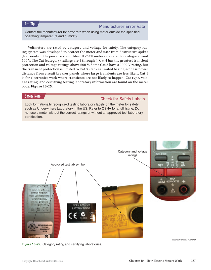 Copyright Goodheart-Willcox Co., Inc. Chapter 10 How Electric Meters Work 187 Voltmeters are rated by category and voltage for safety. The category rat- ing system was developed to protect the meter and user from destructive spikes (transients in the power system). Most HVACR meters are rated for category 3 and 600 V. The Cat (category) ratings are 1 through 4. Cat 4 has the greatest transient protection and voltage ratings above 600 V. Some Cat 3 have a 1000 V rating, but the transient protection is limited to Cat 3. Cat 2 is limited to single-phase power distance from circuit breaker panels where large transients are less likely. Cat 1 is for electronics work where transients are not likely to happen. Cat type, volt- age rating, and certifying testing laboratory information are found on the meter body, Figure 10-25. Manufacturer Error Rate Contact the manufacturer for error rate when using meter outside the specified operating temperature and humidity. Pro Tip Check for Safety Labels Look for nationally recognized testing laboratory labels on the meter for safety, such as Underwriters Laboratory in the US. Refer to OSHA for a full listing. Do not use a meter without the correct ratings or without an approved test laboratory certification. Safety Note Category and voltage ratings Approved test lab symbol Goodheart-Willcox Publisher Figure 10-25. Category rating and certifying laboratories.