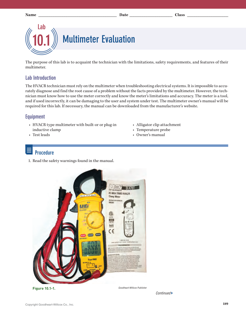 189 Copyright Goodheart-Willcox Co., Inc. Name __________________________________________ Date _______________________ Class ______________________ The purpose of this lab is to acquaint the technician with the limitations, safety requirements, and features of their multimeter. Lab Introduction The HVACR technician must rely on the multimeter when troubleshooting electrical systems. It is impossible to accu- rately diagnose and find the root cause of a problem without the facts provided by the multimeter. However, the tech- nician must know how to use the meter correctly and know the meter’s limitations and accuracy. The meter is a tool, and if used incorrectly, it can be damaging to the user and system under test. The multimeter owner’s manual will be required for this lab. If necessary, the manual can be downloaded from the manufacturer’s website. Equipment • HVACR type multimeter with built-or or plug-in inductive clamp • Test leads • Alligator clip attachment • Temperature probe • Owner’s manual Procedure 1. Read the safety warnings found in the manual. Goodheart-Willcox Publisher Figure 10.1-1. Lab 10.1 Multimeter Evaluation Continued