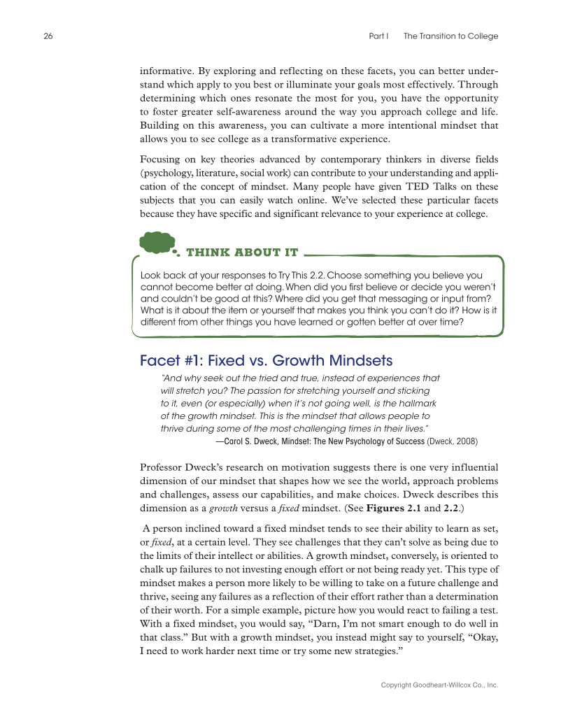 26 Part I The Transition to College Copyright Goodheart-Willcox Co., Inc. informative. By exploring and reflecting on these facets, you can better under- stand which apply to you best or illuminate your goals most effectively. Through determining which ones resonate the most for you, you have the opportunity to foster greater self-awareness around the way you approach college and life. Building on this awareness, you can cultivate a more intentional mindset that allows you to see college as a transformative experience. Focusing on key theories advanced by contemporary thinkers in diverse fields (psychology, literature, social work) can contribute to your understanding and appli- cation of the concept of mindset. Many people have given TED Talks on these subjects that you can easily watch online. We’ve selected these particular facets because they have specific and significant relevance to your experience at college. Facet #1: Fixed vs. Growth Mindsets “And why seek out the tried and true, instead of experiences that will stretch you? The passion for stretching yourself and sticking to it, even (or especially) when it’s not going well, is the hallmark of the growth mindset. This is the mindset that allows people to thrive during some of the most challenging times in their lives.” —Carol S. Dweck, Mindset: The New Psychology of Success (Dweck, 2008) Professor Dweck’s research on motivation suggests there is one very influential dimension of our mindset that shapes how we see the world, approach problems and challenges, assess our capabilities, and make choices. Dweck describes this dimension as a growth versus a fixed mindset. (See Figures 2.1 and 2.2.) A person inclined toward a fixed mindset tends to see their ability to learn as set, or fixed, at a certain level. They see challenges that they can’t solve as being due to the limits of their intellect or abilities. A growth mindset, conversely, is oriented to chalk up failures to not investing enough effort or not being ready yet. This type of mindset makes a person more likely to be willing to take on a future challenge and thrive, seeing any failures as a reflection of their effort rather than a determination of their worth. For a simple example, picture how you would react to failing a test. With a fixed mindset, you would say, “Darn, I’m not smart enough to do well in that class.” But with a growth mindset, you instead might say to yourself, “Okay, I need to work harder next time or try some new strategies.” THINK ABOUT IT Look back at your responses to Try This 2.2. Choose something you believe you cannot become better at doing. When did you first believe or decide you weren’t and couldn’t be good at this? Where did you get that messaging or input from? What is it about the item or yourself that makes you think you can’t do it? How is it different from other things you have learned or gotten better at over time?