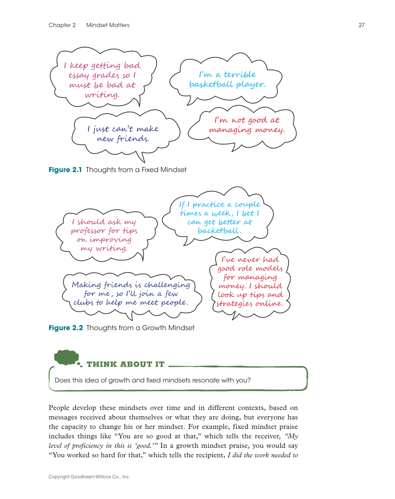 27 Chapter 2 Mindset Matters Copyright Goodheart-Willcox Co., Inc. People develop these mindsets over time and in different contexts, based on messages received about themselves or what they are doing, but everyone has the capacity to change his or her mindset. For example, fixed mindset praise includes things like “You are so good at that,” which tells the receiver, “My level of proficiency in this is ‘good.’” In a growth mindset praise, you would say “You worked so hard for that,” which tells the recipient, I did the work needed to Figure 2.1 Thoughts from a Fixed Mindset I g564g557g657g606 g560g591g1342g662ng594 bag589 eg575sg651g616 g660rag555eg609 sg603 I g667usg610 g553g591 bag589 ag610 g680g674ig676g662ng594. I g663usg610 cg651g602’g610 mg618g564g591 g568g657g614 g659g674g562g657ndg609. I’g601 g602g1320 gg569og589 ag610 mg651nag660g662ng594 mg669g568g657g616. I’g601 g584 g576g657rg674g629g620g565g591 bag642g564eg643bg618g632g599 g639lg651g582g657g608. Figure 2.2 Thoughts from a Growth Mindset I g642hg669g645lg589 ag642g598 g667g616 g672g608g1336eg575sg669g608 fg669g608 g676g662pg609 g669g602 g662g667g672rg669g679g662ng594 g667g616 g680g674ig676g662ng594. Mg618g664g662ng594 g659g674g562g657ndg609 ig609 g621hg618g632g565g657ng660g662ng594 fg669g608 g567g591, sg603 I’g632g599 jg669g662g602 g584 g559g657g614 g621g665g645bg609 tg603 g561g624g665g606 g567g591 g567g557eg610 g572eg669g639g565g591. Ig593 I g672racg676ig554g591 g584 cg669g678g639g565g591 g676g662g567eg609 g584 g580g557g624g598, I g553eg610 I cg651g602 g560eg610 g553g591g1341g657g608 ag610 bag621g564eg643bg618g632g599. I’g579g591 g568g657g579g657g608 hag589 gg569og589 rg636g565g591 mog555g624lg609 fg669g608 mg651nag660g662ng594 mg669g568g657g616. I g642hg669g645lg589 log636g598 g678g606 g676g662pg609 g651ng589 sg676rag576eg660g562eg609 g669g635g665g662g568g591. THINK ABOUT IT Does this idea of growth and fixed mindsets resonate with you?