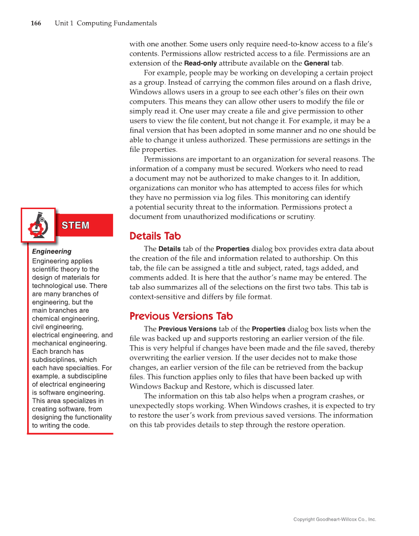 Copyright Goodheart-Willcox Co., Inc. 166 Unit 1 Computing Fundamentals with one another. Some users only require need-to-know access to a fi le’s contents. Permissions allow restricted access to a fi le. Permissions are an extension of the Read-only attribute available on the General tab. For example, people may be working on developing a certain project as a group. Instead of carrying the common fi les around on a fl ash drive, Windows allows users in a group to see each other’s fi les on their own computers. This means they can allow other users to modify the fi le or simply read it. One user may create a fi le and give permission to other users to view the fi le content, but not change it. For example, it may be a fi nal version that has been adopted in some manner and no one should be able to change it unless authorized. These permissions are settings in the fi le properties. Permissions are important to an organization for several reasons. The information of a company must be secured. Workers who need to read a document may not be authorized to make changes to it. In addition, organizations can monitor who has attempted to access files for which they have no permission via log files. This monitoring can identify a potential security threat to the information. Permissions protect a document from unauthorized modifications or scrutiny. Details Tab The Details tab of the Properties dialog box provides extra data about the creation of the fi le and information related to authorship. On this tab, the fi le can be assigned a title and subject, rated, tags added, and comments added. It is here that the author’s name may be entered. The tab also summarizes all of the selections on the fi rst two tabs. This tab is context-sensitive and differs by fi le format. Previous Versions Tab The Previous Versions tab of the Properties dialog box lists when the fi le was backed up and supports restoring an earlier version of the fi le. This is very helpful if changes have been made and the fi le saved, thereby overwriting the earlier version. If the user decides not to make those changes, an earlier version of the fi le can be retrieved from the backup fi les. This function applies only to fi les that have been backed up with Windows Backup and Restore, which is discussed later. The information on this tab also helps when a program crashes, or unexpectedly stops working. When Windows crashes, it is expected to try to restore the user’s work from previous saved versions. The information on this tab provides details to step through the restore operation. Engineering Engineering applies scientific theory to the design of materials for technological use. There are many branches of engineering, but the main branches are chemical engineering, civil engineering, electrical engineering, and mechanical engineering. Each branch has subdisciplines, which each have specialties. For example, a subdiscipline of electrical engineering is software engineering. This area specializes in creating software, from designing the functionality to writing the code. STEM STEM
