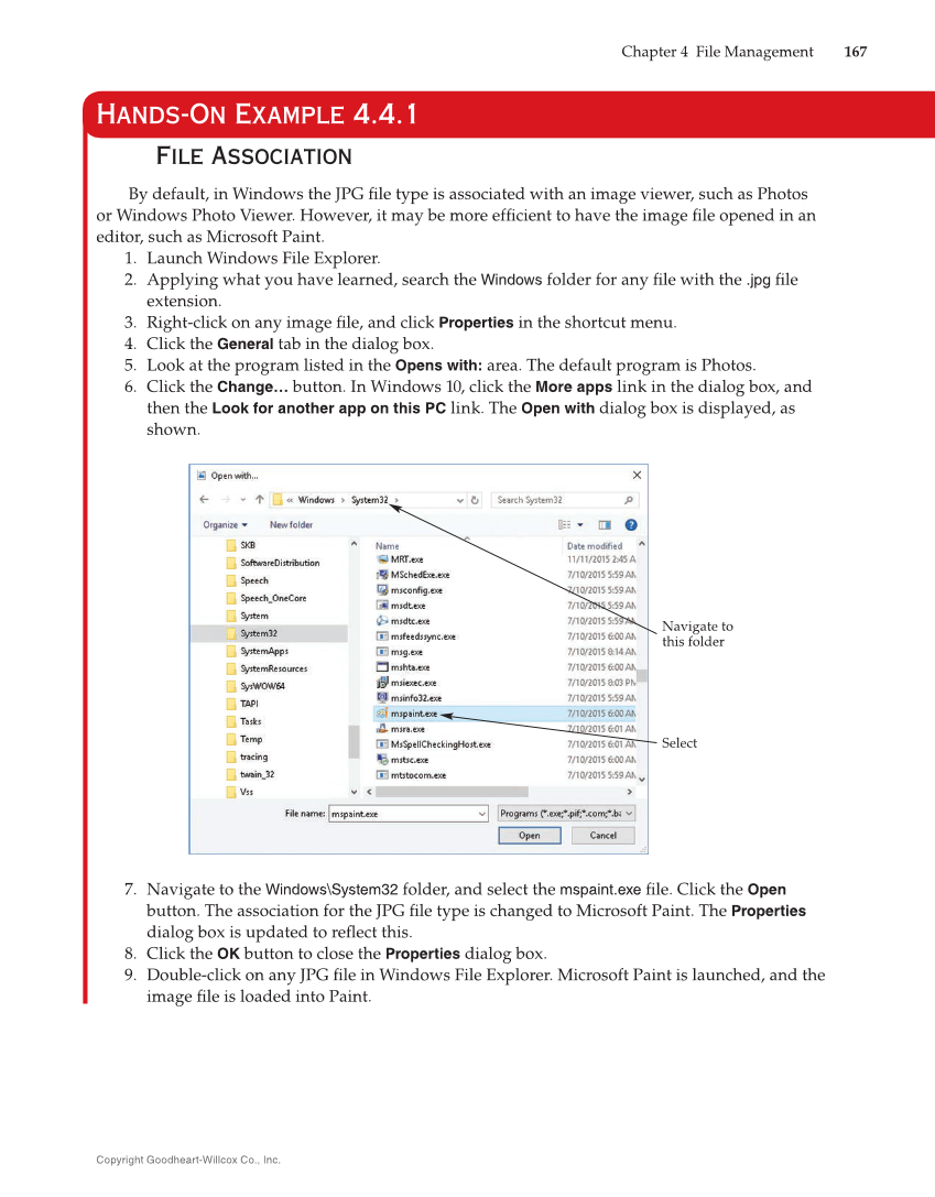 Copyright Goodheart-Willcox Co., Inc. Chapter 4 File Management 167 File Association By default, in Windows the JPG fi le type is associated with an image viewer, such as Photos or Windows Photo Viewer. However, it may be more effi cient to have the image fi le opened in an editor, such as Microsoft Paint. 1. Launch Windows File Explorer. 2. Applying what you have learned, search the Windows folder for any fi le with the .jpg fi le extension. 3. Right-click on any image fi le, and click Properties in the shortcut menu. 4. Click the General tab in the dialog box. 5. Look at the program listed in the Opens with: area. The default program is Photos. 6. Click the Change… button. In Windows 10, click the More apps link in the dialog box, and then the Look for another app on this PC link. The Open with dialog box is displayed, as shown. Hands-On Example 4.4.1 Navigate to this folder Select 7. Navigate to the Windows\System32 folder, and select the mspaint.exe fi le. Click the Open button. The association for the JPG fi le type is changed to Microsoft Paint. The Properties dialog box is updated to refl ect this. 8. Click the OK button to close the Properties dialog box. 9. Double-click on any JPG fi le in Windows File Explorer. Microsoft Paint is launched, and the image fi le is loaded into Paint.