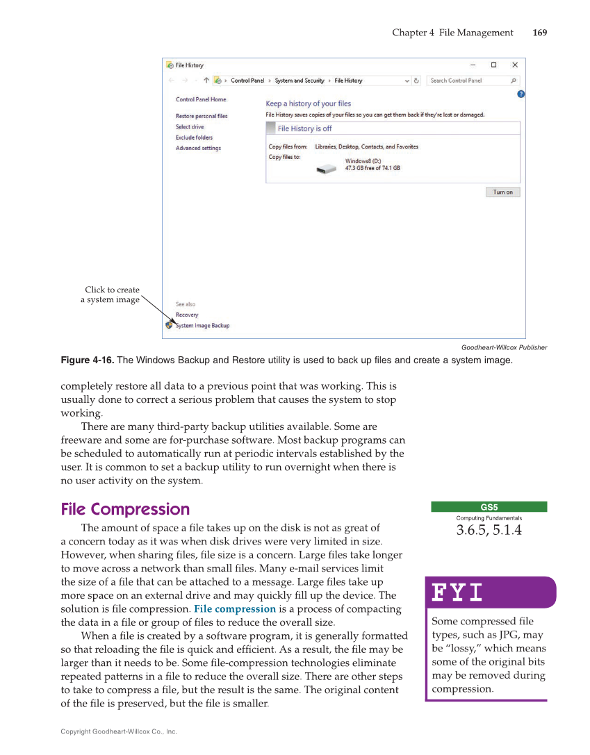 Copyright Goodheart-Willcox Co., Inc. Chapter 4 File Management 169 completely restore all data to a previous point that was working. This is usually done to correct a serious problem that causes the system to stop working. There are many third-party backup utilities available. Some are freeware and some are for-purchase software. Most backup programs can be scheduled to automatically run at periodic intervals established by the user. It is common to set a backup utility to run overnight when there is no user activity on the system. File Compression The amount of space a fi le takes up on the disk is not as great of a concern today as it was when disk drives were very limited in size. However, when sharing fi les, fi le size is a concern. Large fi les take longer to move across a network than small fi les. Many e-mail services limit the size of a fi le that can be attached to a message. Large fi les take up more space on an external drive and may quickly fi ll up the device. The solution is fi le compression. File compression is a process of compacting the data in a fi le or group of fi les to reduce the overall size. When a fi le is created by a software program, it is generally formatted so that reloading the fi le is quick and effi cient. As a result, the fi le may be larger than it needs to be. Some fi le-compression technologies eliminate repeated patterns in a fi le to reduce the overall size. There are other steps to take to compress a fi le, but the result is the same. The original content of the fi le is preserved, but the fi le is smaller. GS5 Computing Fundamentals 3.6.5, 5.1.4 FYI FYI Some compressed fi le types, such as JPG, may be “lossy,” which means some of the original bits may be removed during compression. Click to create a system image Goodheart-Willcox Publisher Figure 4-16. The Windows Backup and Restore utility is used to back up files and create a system image.