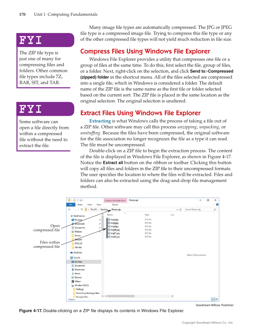 Copyright Goodheart-Willcox Co., Inc. 170 Unit 1 Computing Fundamentals Many image fi le types are automatically compressed. The JPG or JPEG fi le type is a compressed image fi le. Trying to compress this fi le type or any of the other compressed fi le types will not yield much reduction in fi le size. Compress Files Using Windows File Explorer Windows File Explorer provides a utility that compresses one fi le or a group of fi les at the same time. To do this, fi rst select the fi le, group of fi les, or a folder. Next, right-click on the selection, and click Send to Compressed (zipped) folder in the shortcut menu. All of the fi les selected are compressed into a single fi le, which in Windows is considered a folder. The default name of the ZIP fi le is the same name as the fi rst fi le or folder selected based on the current sort. The ZIP fi le is placed in the same location as the original selection. The original selection is unaltered. Extract Files Using Windows File Explorer Extracting is what Windows calls the process of taking a fi le out of a ZIP fi le. Other software may call this process unzipping, unpacking, or unstuffi ng. Because the fi les have been compressed, the original software for the fi le association no longer recognizes the fi le as a type it can read. The fi le must be uncompressed. Double-click on a ZIP fi le to begin the extraction process. The content of the fi le is displayed in Windows File Explorer, as shown in Figure 4-17. Notice the Extract all button on the ribbon or toolbar. Clicking this button will copy all fi les and folders in the ZIP fi le to their uncompressed formats. The user specifi es the location to where the fi les will be extracted. Files and folders can also be extracted using the drag-and-drop fi le management method. FYI FYI The ZIP fi le type is just one of many for compressing fi les and folders. Other common fi le types include 7Z, RAR, SIT, and TAR. FYI FYI Some software can open a fi le directly from within a compressed fi le without the need to extract the fi le. Files within compressed file Open compressed file Goodheart-Willcox Publisher Figure 4-17. Double-clicking on a ZIP file displays its contents in Windows File Explorer.