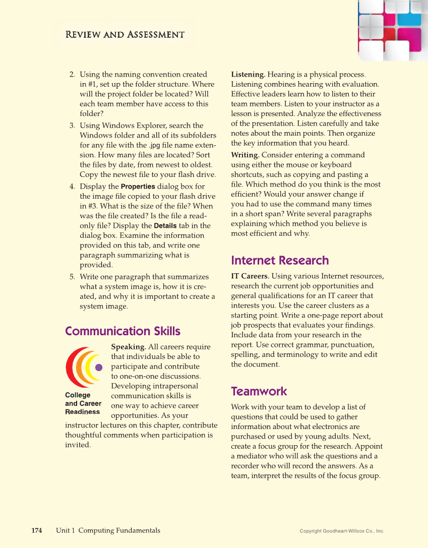 Review and Assessment Review and Assessment 174 Unit 1 Computing Fundamentals Copyright Goodheart-Willcox Co., Inc. 2. Using the naming convention created in #1, set up the folder structure. Where will the project folder be located? Will each team member have access to this folder? 3. Using Windows Explorer, search the Windows folder and all of its subfolders for any fi le with the .jpg fi le name exten- sion. How many fi les are located? Sort the fi les by date, from newest to oldest. Copy the newest fi le to your fl ash drive. 4. Display the Properties dialog box for the image fi le copied to your fl ash drive in #3. What is the size of the fi le? When was the fi le created? Is the fi le a read- only fi le? Display the Details tab in the dialog box. Examine the information provided on this tab, and write one paragraph summarizing what is provided. 5. Write one paragraph that summarizes what a system image is, how it is cre- ated, and why it is important to create a system image. Communication Skills Speaking. All careers require that individuals be able to participate and contribute to one-on-one discussions. Developing intrapersonal communication skills is one way to achieve career opportunities. As your instructor lectures on this chapter, contribute thoughtful comments when participation is invited. College and Career Readiness Listening. Hearing is a physical process. Listening combines hearing with evaluation. Effective leaders learn how to listen to their team members. Listen to your instructor as a lesson is presented. Analyze the effectiveness of the presentation. Listen carefully and take notes about the main points. Then organize the key information that you heard. Writing. Consider entering a command using either the mouse or keyboard shortcuts, such as copying and pasting a fi le. Which method do you think is the most effi cient? Would your answer change if you had to use the command many times in a short span? Write several paragraphs explaining which method you believe is most effi cient and why. Internet Research IT Careers. Using various Internet resources, research the current job opportunities and general qualifi cations for an IT career that interests you. Use the career clusters as a starting point. Write a one-page report about job prospects that evaluates your fi ndings. Include data from your research in the report. Use correct grammar, punctuation, spelling, and terminology to write and edit the document. Teamwork Work with your team to develop a list of questions that could be used to gather information about what electronics are purchased or used by young adults. Next, create a focus group for the research. Appoint a mediator who will ask the questions and a recorder who will record the answers. As a team, interpret the results of the focus group.