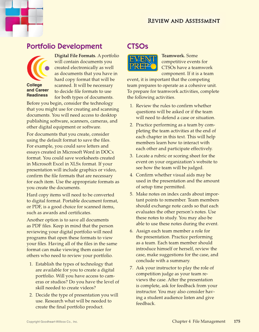 Review and AssessmenttnemssessA Review R R R e v e w w and a a n d d A A A s s e s s m e n n t t t R R R e e i e e w w w a a d d A A s s s s e e s s s s e e t t t i e e w w w a a a n n d d A A A s s s s e e s s s s m m e e n n n t t t R R R R e e v i w w s Review and Assessment Review and Assessment Chapter 4 File Management 175 Copyright Goodheart-Willcox Co., Inc. Portfolio Development Digital File Formats. A portfolio will contain documents you created electronically as well as documents that you have in hard copy format that will be scanned. It will be necessary to decide fi le formats to use for both types of documents. Before you begin, consider the technology that you might use for creating and scanning documents. You will need access to desktop publishing software, scanners, cameras, and other digital equipment or software. For documents that you create, consider using the default format to save the fi les. For example, you could save letters and essays created in Microsoft Word in DOCx format. You could save worksheets created in Microsoft Excel in XLSx format. If your presentation will include graphics or video, confi rm the fi le formats that are necessary for each item. Use the appropriate formats as you create the documents. Hard copy items will need to be converted to digital format. Portable document format, or PDF, is a good choice for scanned items, such as awards and certifi cates. Another option is to save all documents as PDF fi les. Keep in mind that the person reviewing your digital portfolio will need programs that open these formats to view your fi les. Having all of the fi les in the same format can make viewing them easier for others who need to review your portfolio. 1. Establish the types of technology that are available for you to create a digital portfolio. Will you have access to cam- eras or studios? Do you have the level of skill needed to create videos? 2. Decide the type of presentation you will use. Research what will be needed to create the fi nal portfolio product. College and Career Readiness CTSOs Teamwork. Some competitive events for CTSOs have a teamwork component. If it is a team event, it is important that the competing team prepares to operate as a cohesive unit. To prepare for teamwork activities, complete the following activities. 1. Review the rules to confi rm whether questions will be asked or if the team will need to defend a case or situation. 2. Practice performing as a team by com- pleting the team activities at the end of each chapter in this text. This will help members learn how to interact with each other and participate effectively. 3. Locate a rubric or scoring sheet for the event on your organization’s website to see how the team will be judged. 4. Confi rm whether visual aids may be used in the presentation and the amount of setup time permitted. 5. Make notes on index cards about impor- tant points to remember. Team members should exchange note cards so that each evaluates the other person’s notes. Use these notes to study. You may also be able to use these notes during the event. 6. Assign each team member a role for the presentation. Practice performing as a team. Each team member should introduce himself or herself, review the case, make suggestions for the case, and conclude with a summary. 7. Ask your instructor to play the role of competition judge as your team re- views the case. After the presentation is complete, ask for feedback from your instructor. You may also consider hav- ing a student audience listen and give feedback. N EVENT E E E E E V N N N N N N N T T PREP P P P P P P R E P P P P P P EVENT PREP T N N N N N N N N N N N N N N N N N N N N N V V V V V N N N N N N T T T T V N N N N E E E E E E E E V V V V V V V V V V V V E E E E E E E E E N N N N N N N N N N N N T T T T T T T T T T T T EVENT E E E E E E E E E E E E E E E E E E E E E E E E E E E E E E E E E E E E E E E E E E V V V V V V V V V V V V V V V V V V V V V V V V V V V V V V V V V V V V V V V E E E E E E E E E E E E E E E E E E E E E E E N N N N N N N N N N N N N N N N N N N N N N N N N N N N N N N N N N N N N N N N N N N N N N N N N N N N N N T T T T T T T T T T T T T T T T T T T T T T T T T T T T T T T T T T T T T T T T T T T T T T T T T E E E V V V E E E N N N T T T V V V V V V V V T T N E E E V V E E E N N P P P P P P P P P R R R R R R R R E E E E E P P P P P P P P P P P P P P P P P P R R R R R R R P P P P R P R P P P P P P P P P P P P R R R R R R R R R R R R E E E E E E P P P P P P P P P P P P PREP P P P P P P P P P P P P P P P P P P P P P P P P P P P P P P P P P P P P P P P P P P P P P P R R R R R R R R R R R R R R R R R R R R R R R R R R R R R R R R R E E E E E E E E E E E E E E E E E E E E E E P P P P P P P P P P P P P P P P P P P P P P P P P P P P P P P P P P P P P P P P P P P P P P P P R R R E E E P P P PRE P PREP P P P P P P P P P R R R R R R R R R R R R E E E E E E E E E P P P P P P P P P P R R R E E E P P P P P P P P P P P P P P P P P P P P P P P P P P P P P P P P P P P P P P P P P P P R R R E E E P