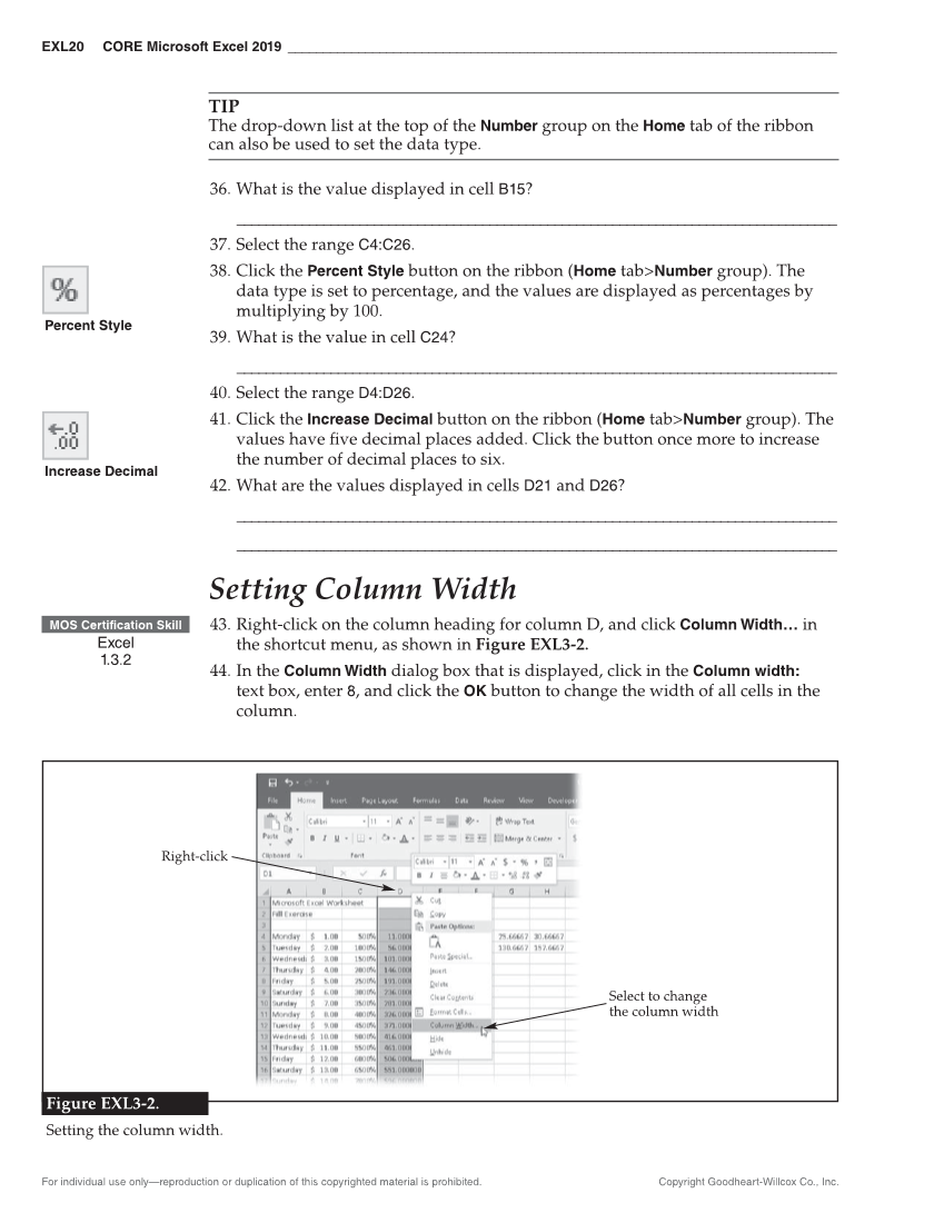 EXL20 CORE Microsoft Excel 2019 ______________________________________________________________________________ For individual use only—reproduction or duplication of this copyrighted material is prohibited. Copyright Goodheart-Willcox Co., Inc. TIP The drop-down list at the top of the Number group on the Home tab of the ribbon can also be used to set the data type. 36. What is the value displayed in cell B15? ___________________________________________________________________________________ 37. Select the range C4:C26. 38. Click the Percent Style button on the ribbon (Home tabNumber group). The data type is set to percentage, and the values are displayed as percentages by multiplying by 100. 39. What is the value in cell C24? ___________________________________________________________________________________ 40. Select the range D4:D26. 41. Click the Increase Decimal button on the ribbon (Home tabNumber group). The values have fi ve decimal places added. Click the button once more to increase the number of decimal places to six. 42. What are the values displayed in cells D21 and D26? ___________________________________________________________________________________ ___________________________________________________________________________________ Setting Column Width 43. Right-click on the column heading for column D, and click Column Width… in the shortcut menu, as shown in Figure EXL3-2. 44. In the Column Width dialog box that is displayed, click in the Column width: text box, enter 8, and click the OK button to change the width of all cells in the column. Percent Style Increase Decimal MOS Certification Skill Excel 1.3.2 Select to change the column width Right-click Figure EXL3-2. Setting the column width.