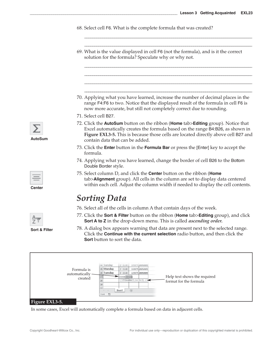 Copyright Goodheart-Willcox Co., Inc. For individual use only—reproduction or duplication of this copyrighted material is prohibited. ___________________________________________________________________________ Lesson 3 Getting Acquainted EXL23 68. Select cell F6. What is the complete formula that was created? ___________________________________________________________________________________ ___________________________________________________________________________________ 69. What is the value displayed in cell F6 (not the formula), and is it the correct solution for the formula? Speculate why or why not. ___________________________________________________________________________________ ___________________________________________________________________________________ ___________________________________________________________________________________ ___________________________________________________________________________________ 70. Applying what you have learned, increase the number of decimal places in the range F4:F6 to two. Notice that the displayed result of the formula in cell F6 is now more accurate, but still not completely correct due to rounding. 71. Select cell B27. 72. Click the AutoSum button on the ribbon (Home tabEditing group). Notice that Excel automatically creates the formula based on the range B4:B26, as shown in Figure EXL3-5. This is because those cells are located directly above cell B27 and contain data that can be added. 73. Click the Enter button in the Formula Bar or press the [Enter] key to accept the formula. 74. Applying what you have learned, change the border of cell B26 to the Bottom Double Border style. 75. Select column D, and click the Center button on the ribbon (Home tabAlignment group). All cells in the column are set to display data centered within each cell. Adjust the column width if needed to display the cell contents. Sorting Data 76. Select all of the cells in column A that contain days of the week. 77. Click the Sort & Filter button on the ribbon (Home tabEditing group), and click Sort A to Z in the drop-down menu. This is called ascending order. 78. A dialog box appears warning that data are present next to the selected range. Click the Continue with the current selection radio button, and then click the Sort button to sort the data. AutoSum Center Sort & Filter Formula is automatically created Help text shows the required format for the formula Figure EXL3-5. In some cases, Excel will automatically complete a formula based on data in adjacent cells.