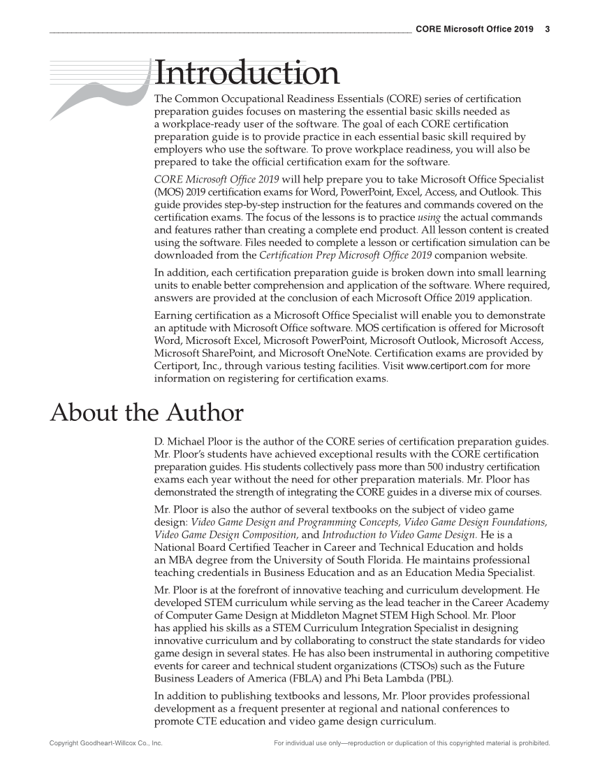 __________________________________________________________________________________ CORE Microsoft Office 2019 3 Copyright Goodheart-Willcox Co., Inc. For individual use only—reproduction or duplication of this copyrighted material is prohibited. Introduction The Common Occupational Readiness Essentials (CORE) series of certifi cation preparation guides focuses on mastering the essential basic skills needed as a workplace-ready user of the software. The goal of each CORE certifi cation preparation guide is to provide practice in each essential basic skill required by employers who use the software. To prove workplace readiness, you will also be prepared to take the offi cial certifi cation exam for the software. CORE Microsoft Offi ce 2019 will help prepare you to take Microsoft Offi ce Specialist (MOS) 2019 certifi cation exams for Word, PowerPoint, Excel, Access, and Outlook. This guide provides step-by-step instruction for the features and commands covered on the certifi cation exams. The focus of the lessons is to practice using the actual commands and features rather than creating a complete end product. All lesson content is created using the software. Files needed to complete a lesson or certifi cation simulation can be downloaded from the Certifi cation Prep Microsoft Offi ce 2019 companion website. In addition, each certifi cation preparation guide is broken down into small learning units to enable better comprehension and application of the software. Where required, answers are provided at the conclusion of each Microsoft Offi ce 2019 application. Earning certifi cation as a Microsoft Offi ce Specialist will enable you to demonstrate an aptitude with Microsoft Offi ce software. MOS certifi cation is offered for Microsoft Word, Microsoft Excel, Microsoft PowerPoint, Microsoft Outlook, Microsoft Access, Microsoft SharePoint, and Microsoft OneNote. Certifi cation exams are provided by Certiport, Inc., through various testing facilities. Visit www.certiport.com for more information on registering for certifi cation exams. About the Author D. Michael Ploor is the author of the CORE series of certifi cation preparation guides. Mr. Ploor’s students have achieved exceptional results with the CORE certifi cation preparation guides. His students collectively pass more than 500 industry certifi cation exams each year without the need for other preparation materials. Mr. Ploor has demonstrated the strength of integrating the CORE guides in a diverse mix of courses. Mr. Ploor is also the author of several textbooks on the subject of video game design: Video Game Design and Programming Concepts, Video Game Design Foundations, Video Game Design Composition, and Introduction to Video Game Design. He is a National Board Certifi ed Teacher in Career and Technical Education and holds an MBA degree from the University of South Florida. He maintains professional teaching credentials in Business Education and as an Education Media Specialist. Mr. Ploor is at the forefront of innovative teaching and curriculum development. He developed STEM curriculum while serving as the lead teacher in the Career Academy of Computer Game Design at Middleton Magnet STEM High School. Mr. Ploor has applied his skills as a STEM Curriculum Integration Specialist in designing innovative curriculum and by collaborating to construct the state standards for video game design in several states. He has also been instrumental in authoring competitive events for career and technical student organizations (CTSOs) such as the Future Business Leaders of America (FBLA) and Phi Beta Lambda (PBL). In addition to publishing textbooks and lessons, Mr. Ploor provides professional development as a frequent presenter at regional and national conferences to promote CTE education and video game design curriculum.