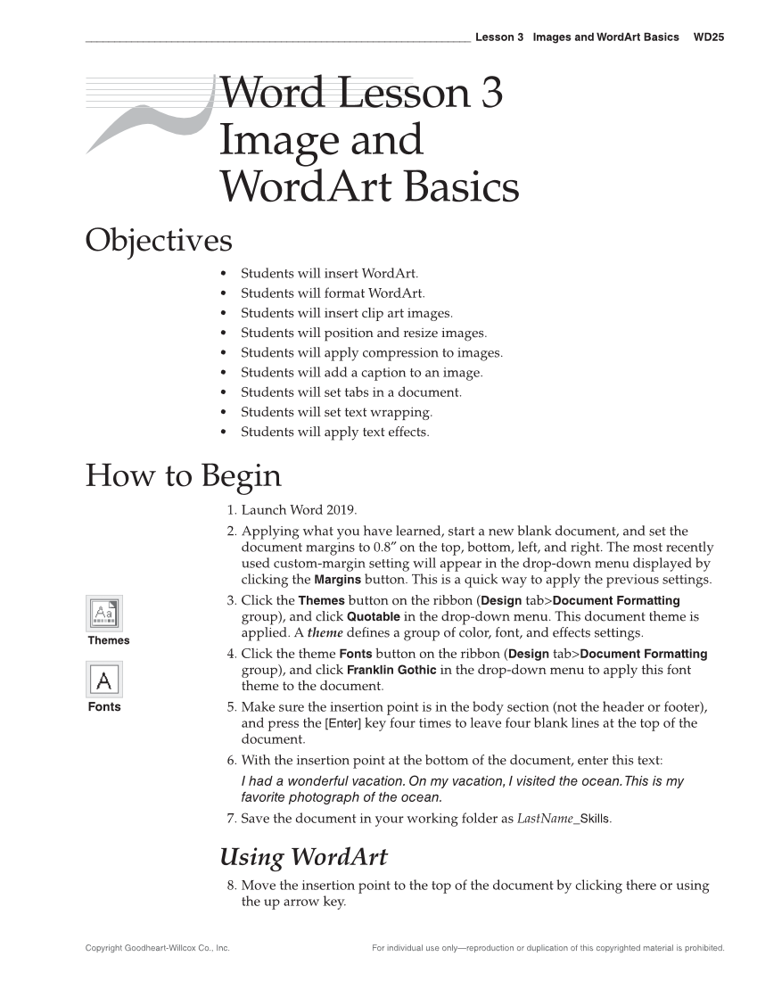Copyright Goodheart-Willcox Co., Inc. For individual use only—reproduction or duplication of this copyrighted material is prohibited. ___________________________________________________________________ Lesson 3 Images and WordArt Basics WD25 Word Lesson 3 Image and WordArt Basics Objectives • Students will insert WordArt. • Students will format WordArt. • Students will insert clip art images. • Students will position and resize images. • Students will apply compression to images. • Students will add a caption to an image. • Students will set tabs in a document. • Students will set text wrapping. • Students will apply text effects. How to Begin 1. Launch Word 2019. 2. Applying what you have learned, start a new blank document, and set the document margins to 0.8″ on the top, bottom, left, and right. The most recently used custom-margin setting will appear in the drop-down menu displayed by clicking the Margins button. This is a quick way to apply the previous settings. 3. Click the Themes button on the ribbon (Design tabDocument Formatting group), and click Quotable in the drop-down menu. This document theme is applied. A theme defi nes a group of color, font, and effects settings. 4. Click the theme Fonts button on the ribbon (Design tabDocument Formatting group), and click Franklin Gothic in the drop-down menu to apply this font theme to the document. 5. Make sure the insertion point is in the body section (not the header or footer), and press the [Enter] key four times to leave four blank lines at the top of the document. 6. With the insertion point at the bottom of the document, enter this text: I had a wonderful vacation. On my vacation, I visited the ocean. This is my favorite photograph of the ocean. 7. Save the document in your working folder as LastName_Skills. Using WordArt 8. Move the insertion point to the top of the document by clicking there or using the up arrow key. Themes Fonts